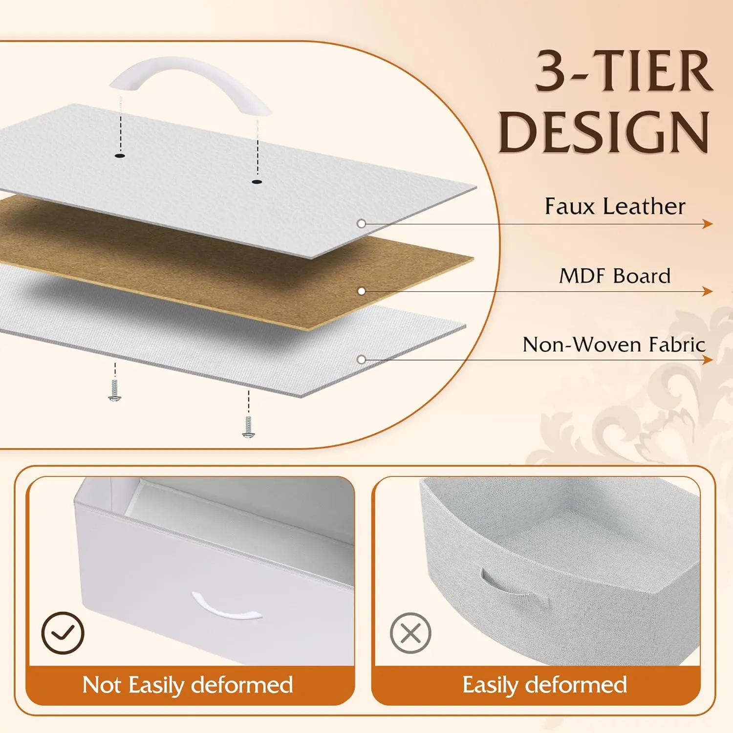 Built with a strong steel frame and X-shaped reinforcement on the back for stability. The water-resistant MDF wood top is easy to clean, while high-quality fabric bins with easy-pull handles resist fading and staining. 🛠️