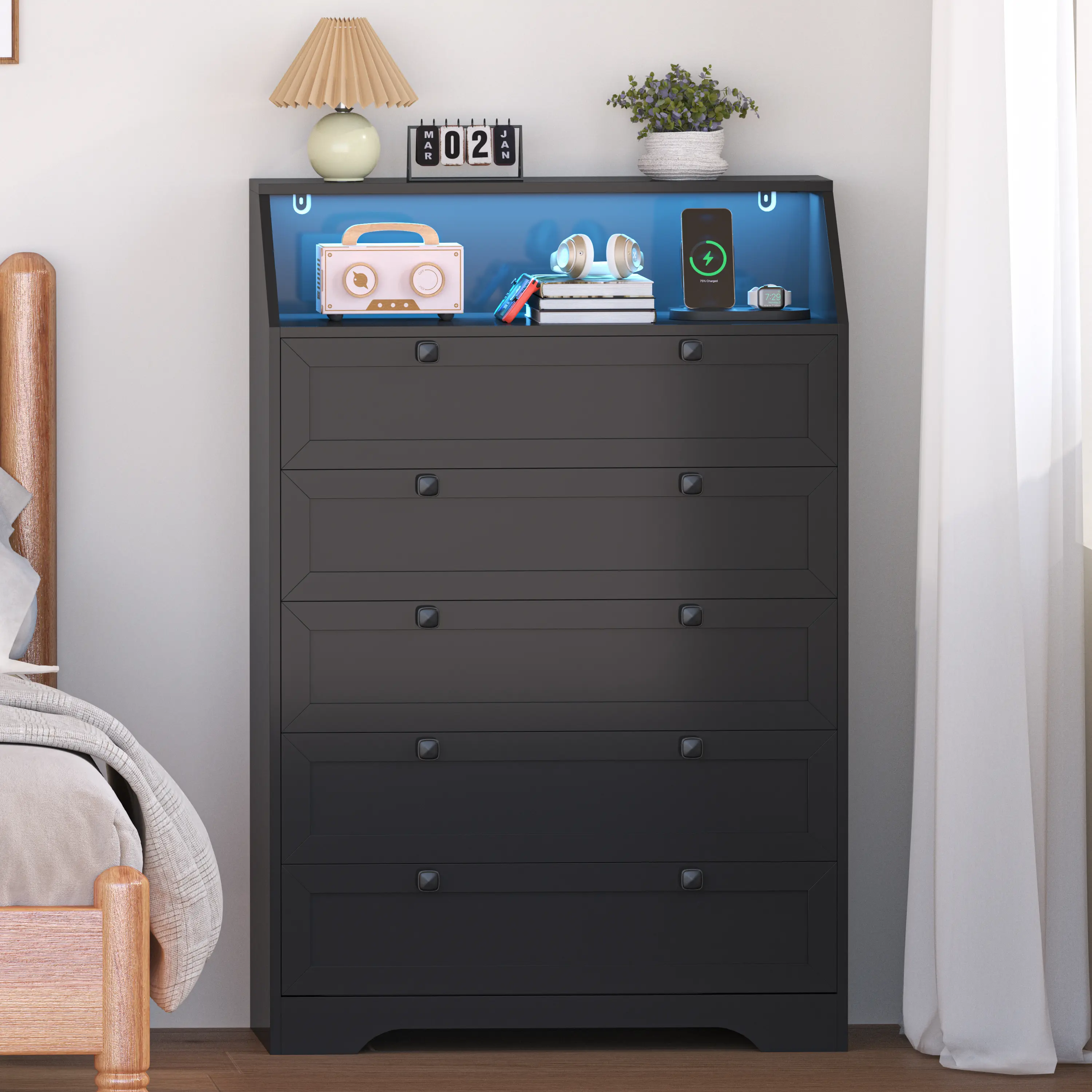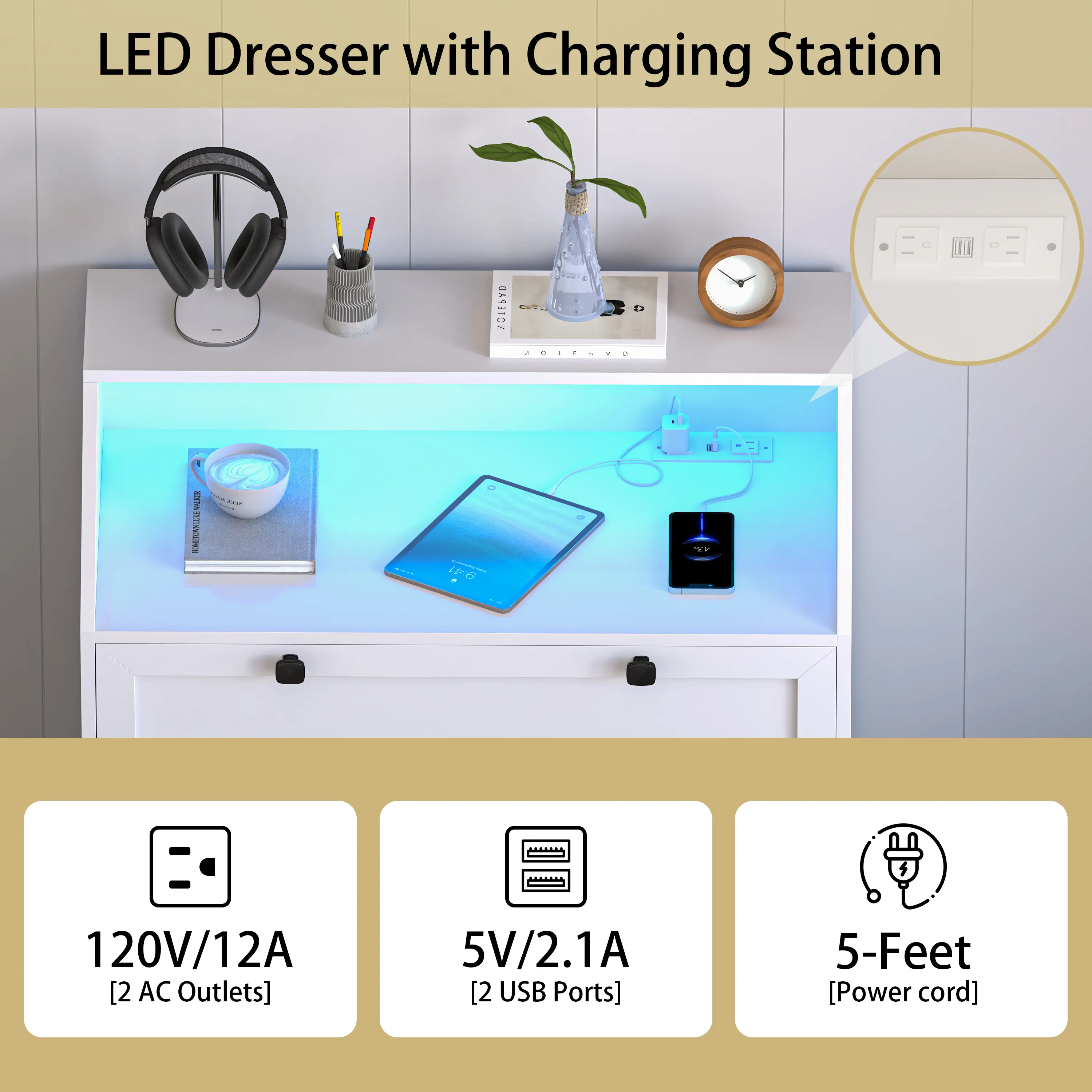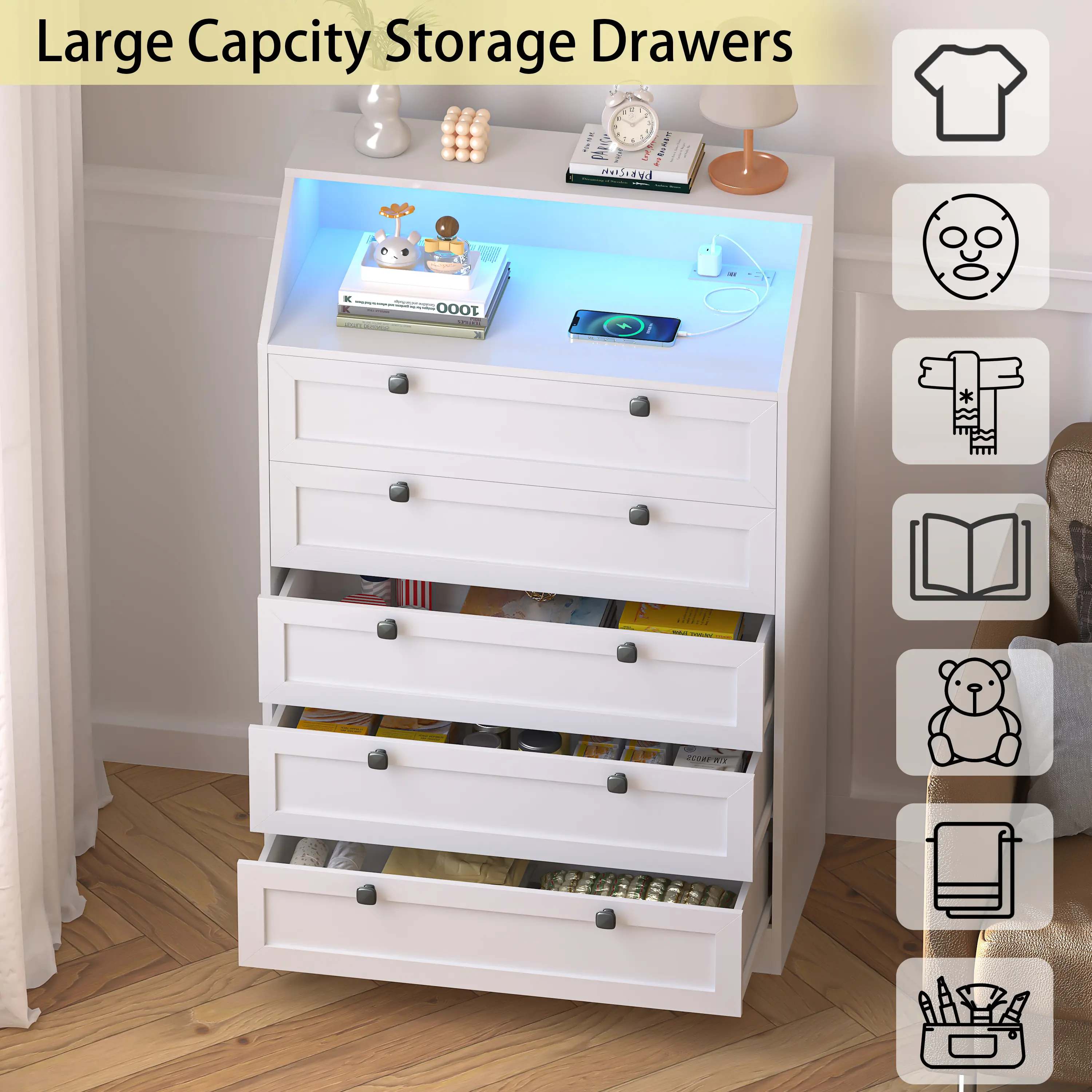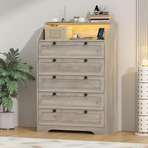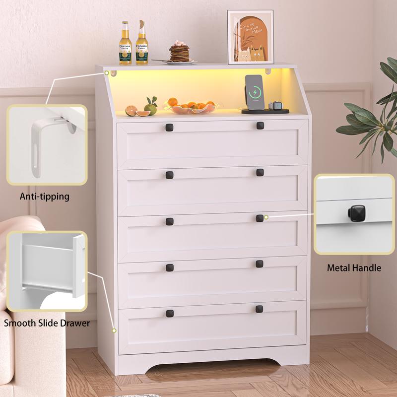 ·Built-in Charging Station for Convenience - Equipped with 2 AC outlets and 2 USB ports, chest of drawers allows you to conveniently charge your devices while keeping your space tidy. Say goodbye to messy cables and enjoy an organized, modern lifestyle.