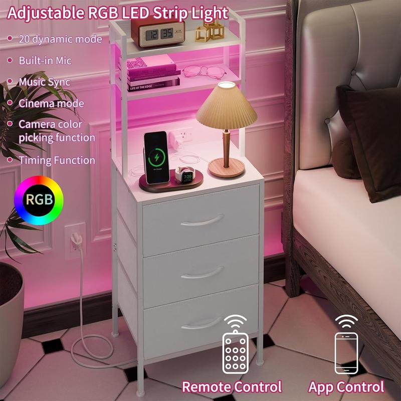 【LED Nightstand with RGB Lighting】This LED nightstand features built-in RGB light strips with adjustable colors, brightness levels, and lighting modes, all easily controlled through an app. The soft lighting is eye-friendly and can sync with music, creating a cozy and relaxing atmosphere for your bedroom or living space. Colorful LED lighting adds a modern and stylish touch to your home.