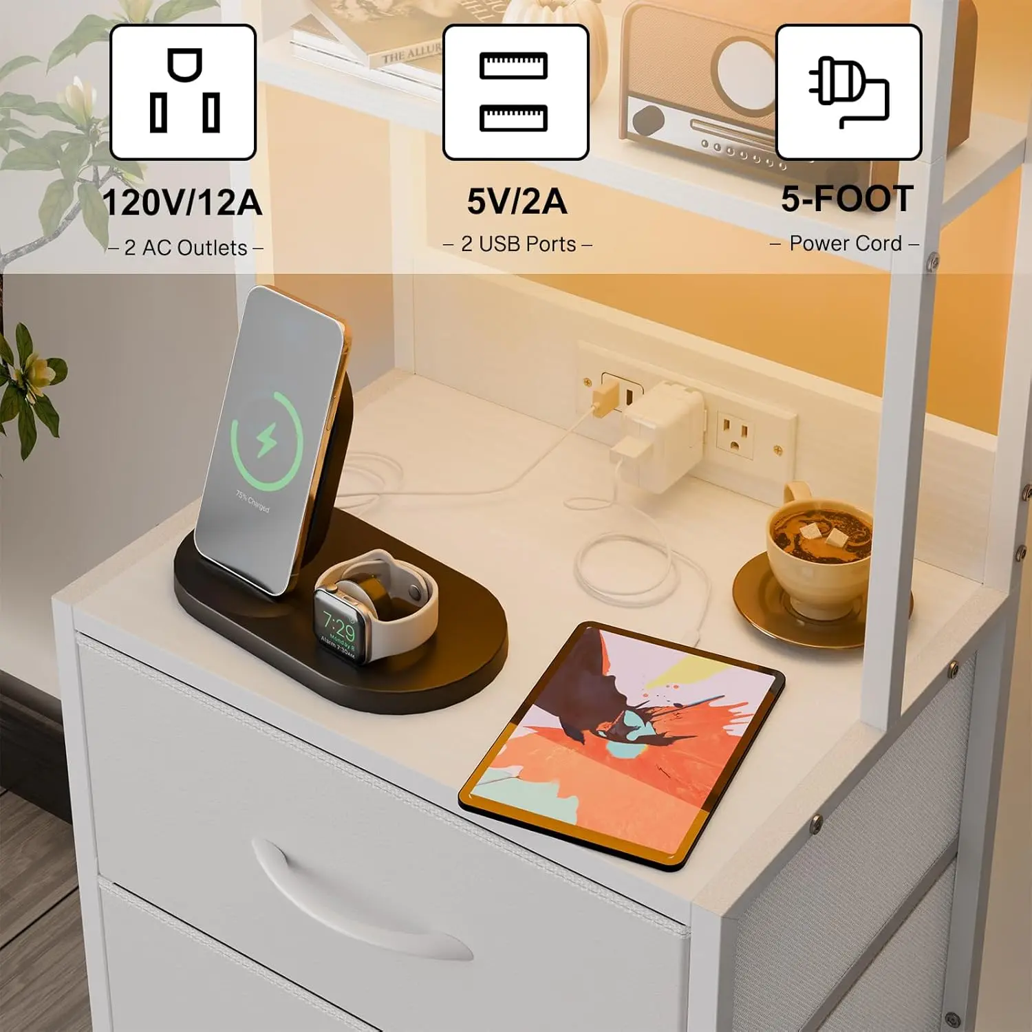 【Tall Nightstand with Charging Station】Equipped with 2 AC outlets, 2 USB ports, and a 5 ft power cord, this bedside table allows you to charge phones, tablets, lamps, and other devices conveniently. Keep all your essentials powered and within reach for a clutter-free charging experience.