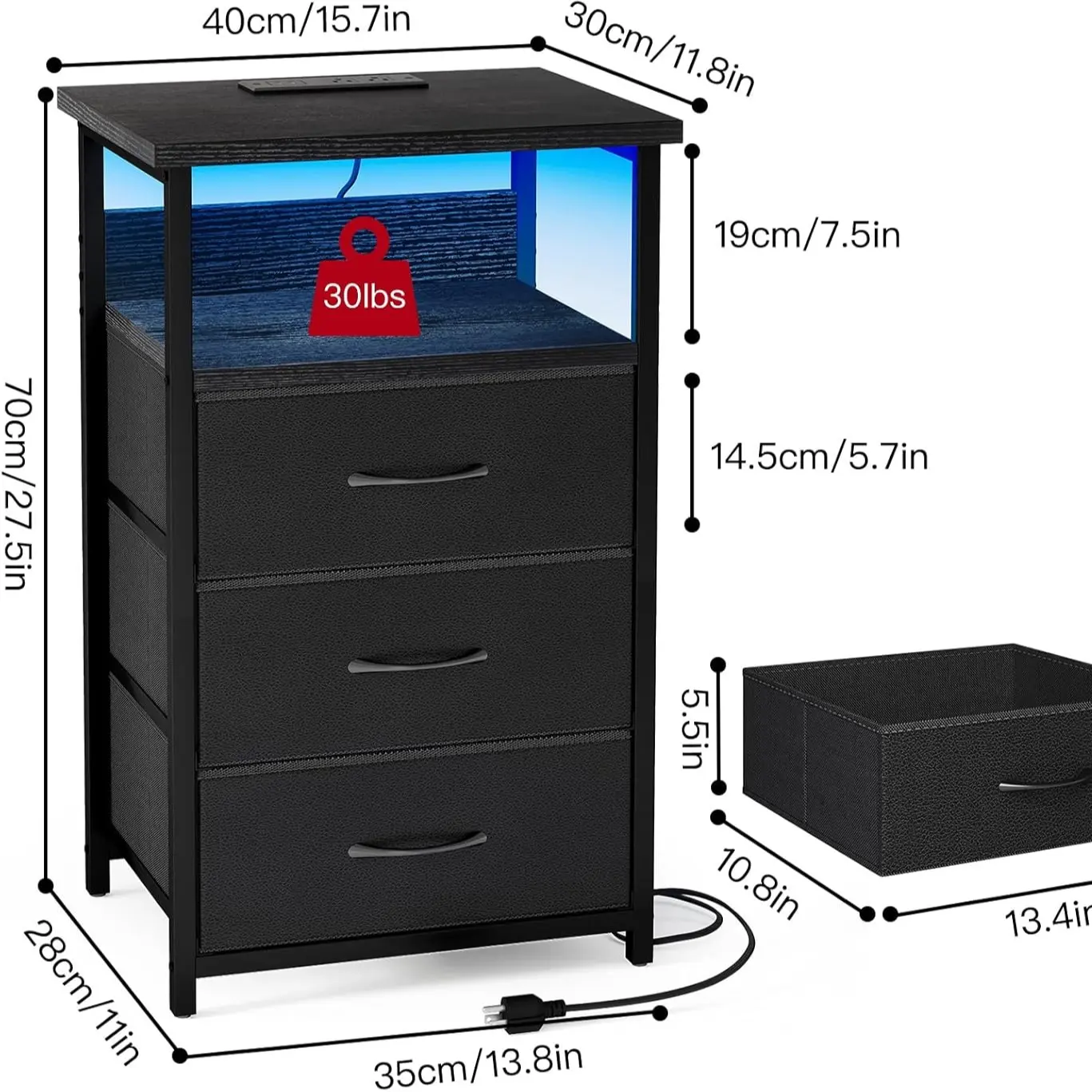 【Nightstand & Bookshelf in One】Three fabric drawers provide ample hidden storage for daily essentials such as keys, glasses, or clothing. Two open shelves offer additional space for lamps, clocks, photo frames, books, or décor. Ideal for bedrooms, living rooms, or beside a sofa for coffee and books.
