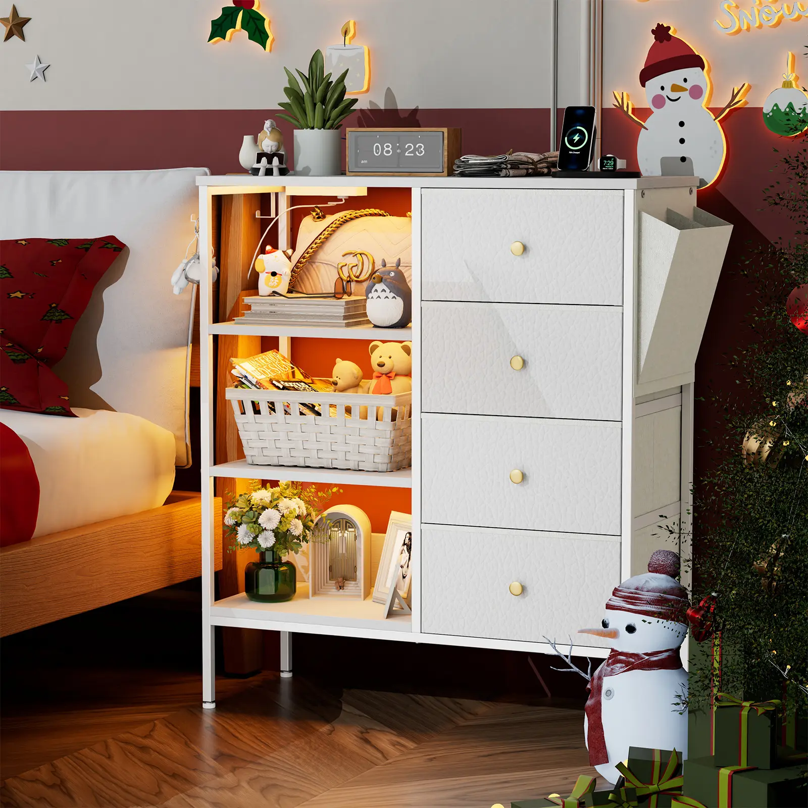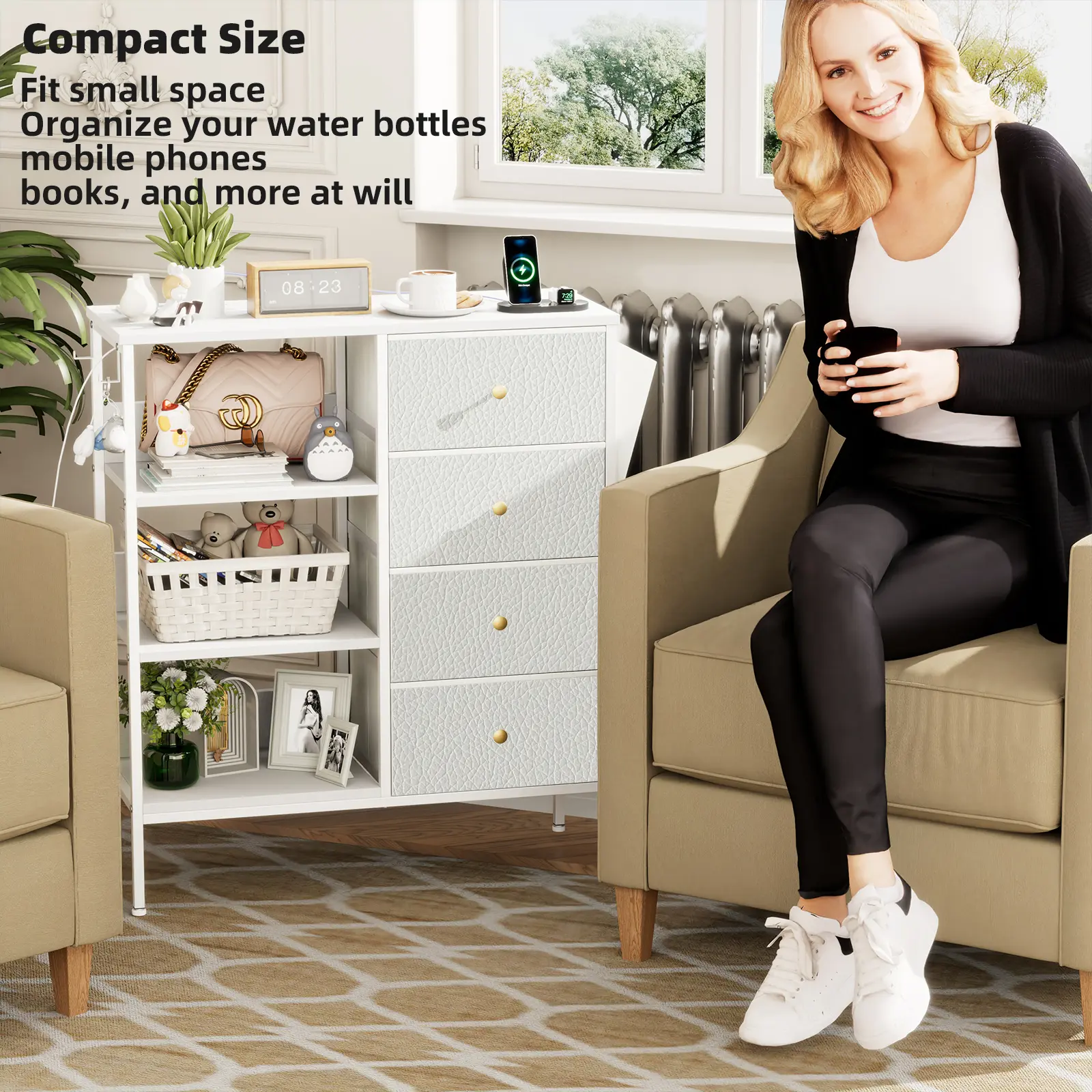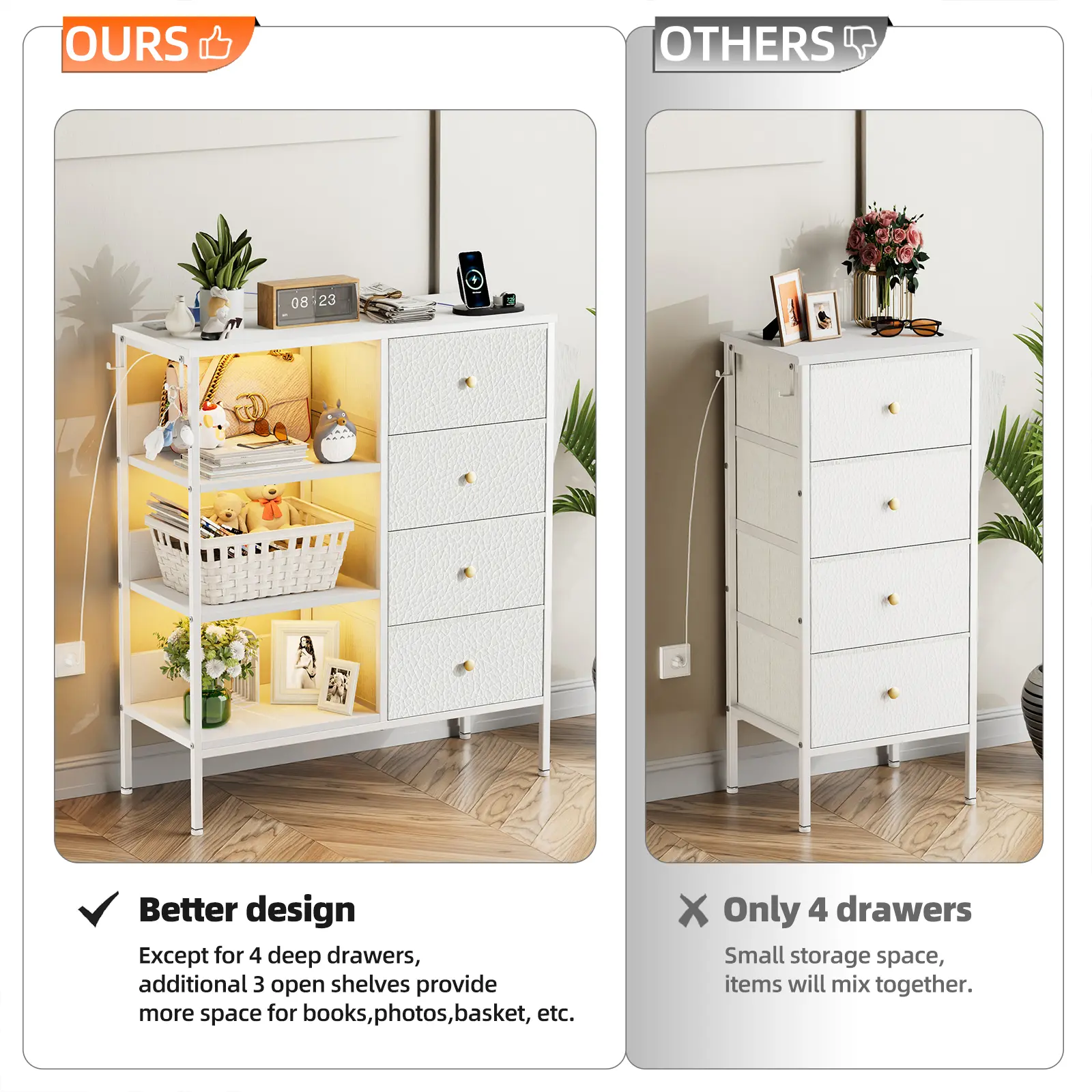 🧺 4 Drawers + 3-Tier Shelf – Keep clothes, books, and essentials neatly organized with both hidden and open storage.