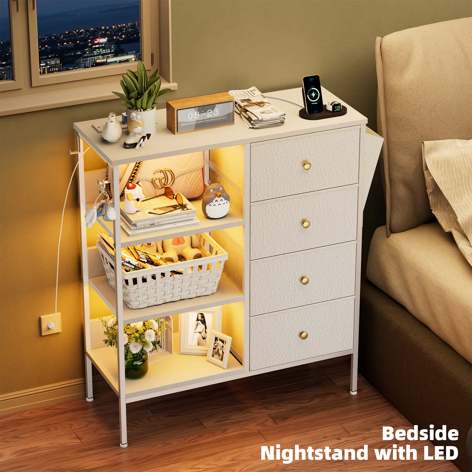 Upgrade your bedside storage with this tall nightstand featuring 4 drawers, a 3-tier open shelf, LED lighting, and a built-in charging station. Designed with a sturdy metal frame and wood top, it combines modern style with practical storage, making it perfect for bedrooms, living rooms, and apartments.
