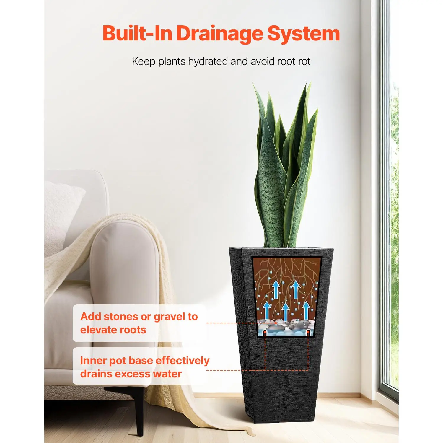 • Built-In Planting Box: This tall planter includes a convenient planting box, letting you choose between potted plants or soil-based gardening. The side pull-ring design makes removal and cleaning a breeze, ideal for balconies, patios, or indoor spaces.