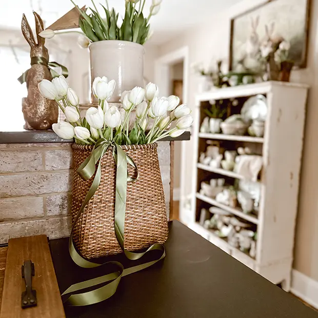Our Tall Rattan Door Basket set isn’t just for a door! Add some tulips and stand them up on your counter or console tables!  @Bryan Cosham-Tittle  #cottage #cottagecore #cottagecoreaesthetic #home #homedecor
