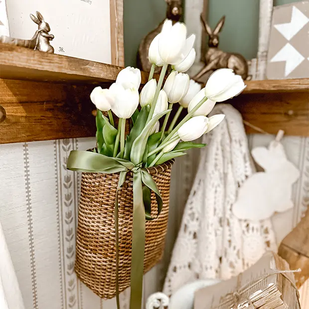 These baskets aren’t just for hanging on the wall. Throw in some tulips and you’ve got a great piece to style on your counters or tables!  @Antique Farm House  #home #homedecor #cottage #cottagecore #cottagecoreaesthetic