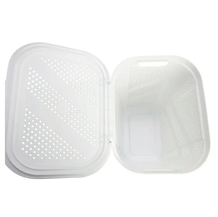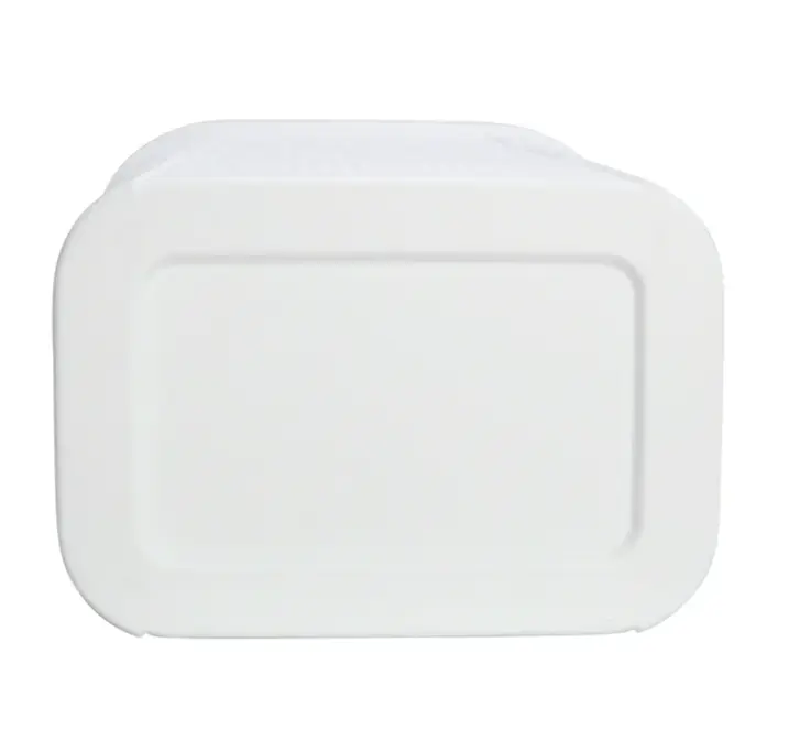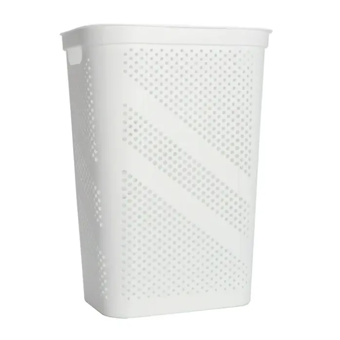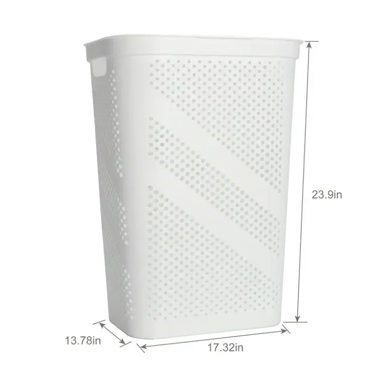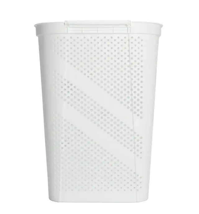 This 24" plastic hinged-lid rectangle laundry hamper in white is a practical choice for all ages. Its rectangular shape and plastic construction ensure it is both functional and durable. Perfect for laundry storage in any home.