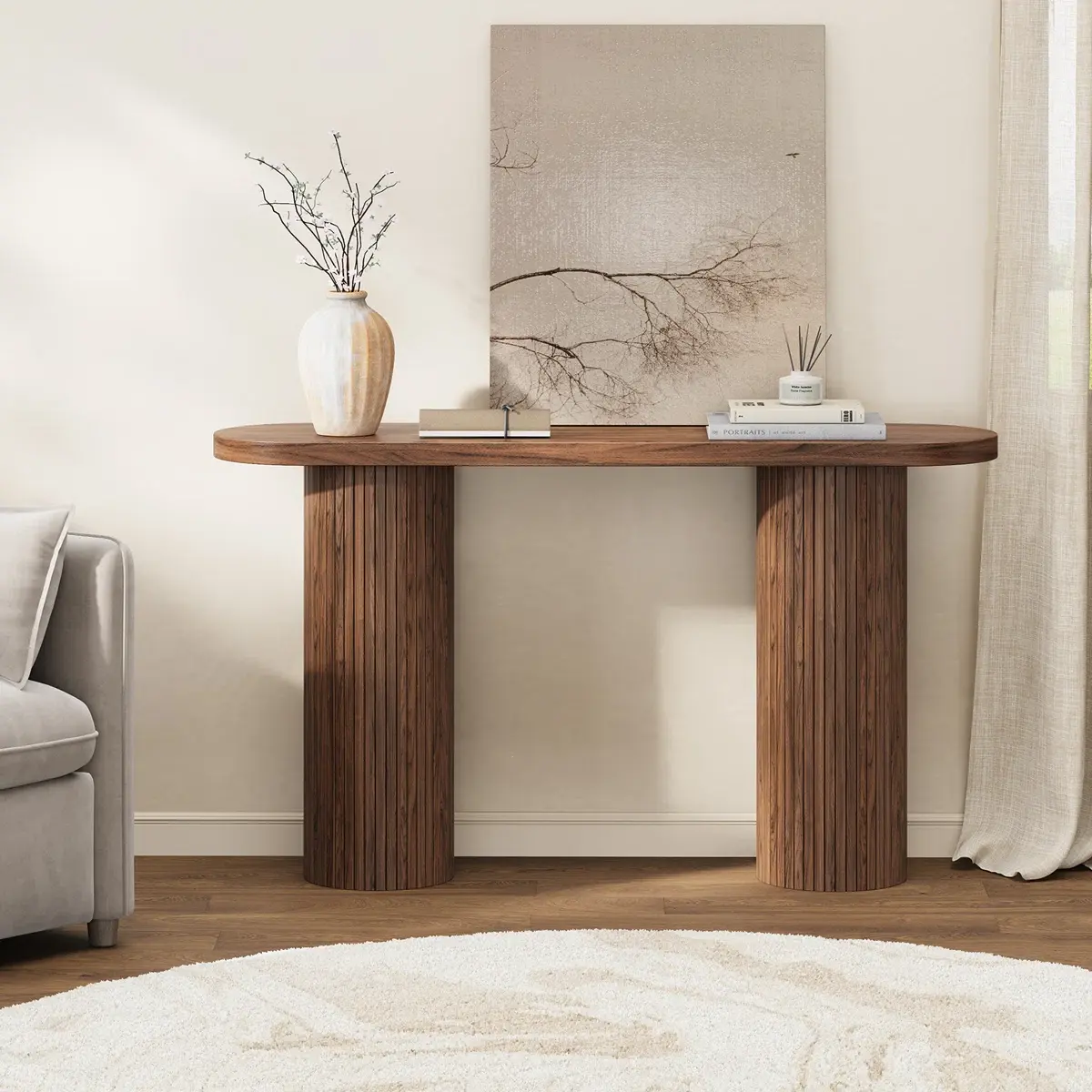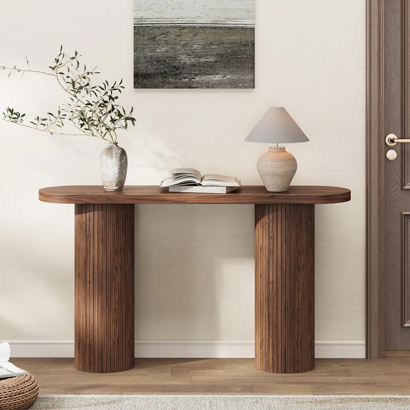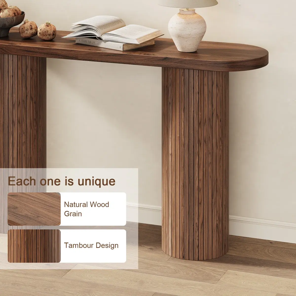 Step into a space where time slows down—this tambour entry console table exudes quiet nostalgia, its wood surface whispering stories of sunlit forests and artisanal hands. Its elliptical shape and wide tambour legs create a simple silhouette that works well in entryways, living rooms, or home offices. Against crisp white walls or moody backdrops, it becomes a bridge between nature’s raw beauty and mindful modern living.