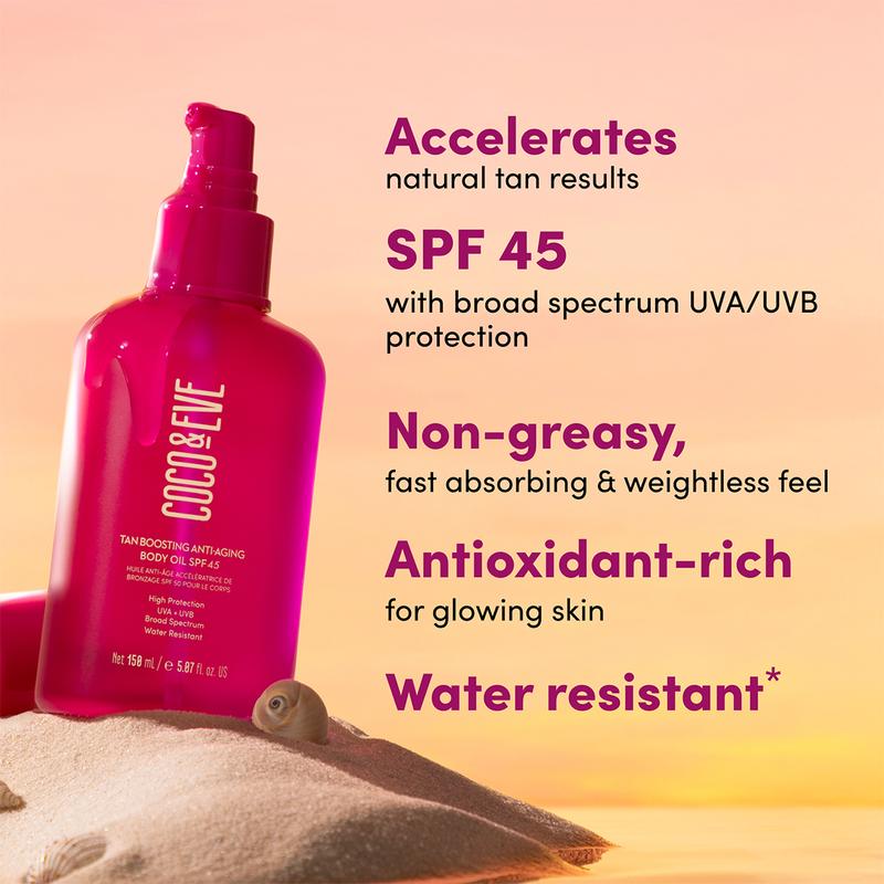 A triple-action SPF body oil that protects from UVA/UVB rays, boosts your natural tan, and fights early signs of aging with nourishing, skin-rejuvenating extracts.