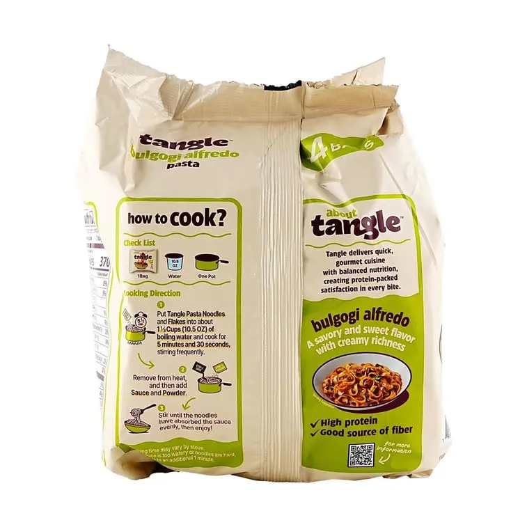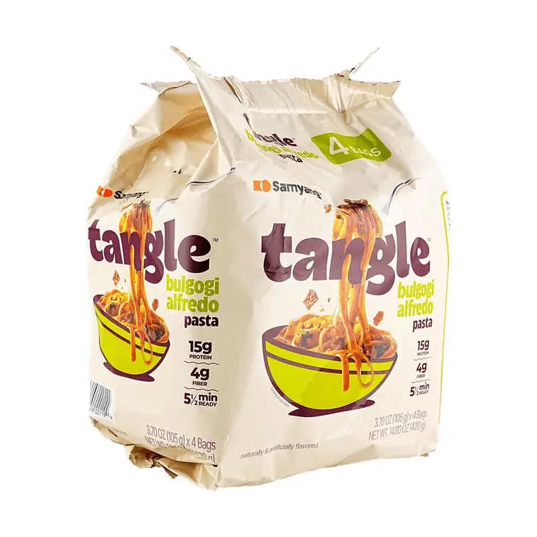 SAMYANG Tangle Bulgogi Afredo Tangluccine is a Korean-inspired fettuccine with creamy Bulgogi sauce. This instant noodle pack includes 4 bags, each weighing 3.8 oz (108g). Perfect for those seeking a flavorful and convenient meal option.