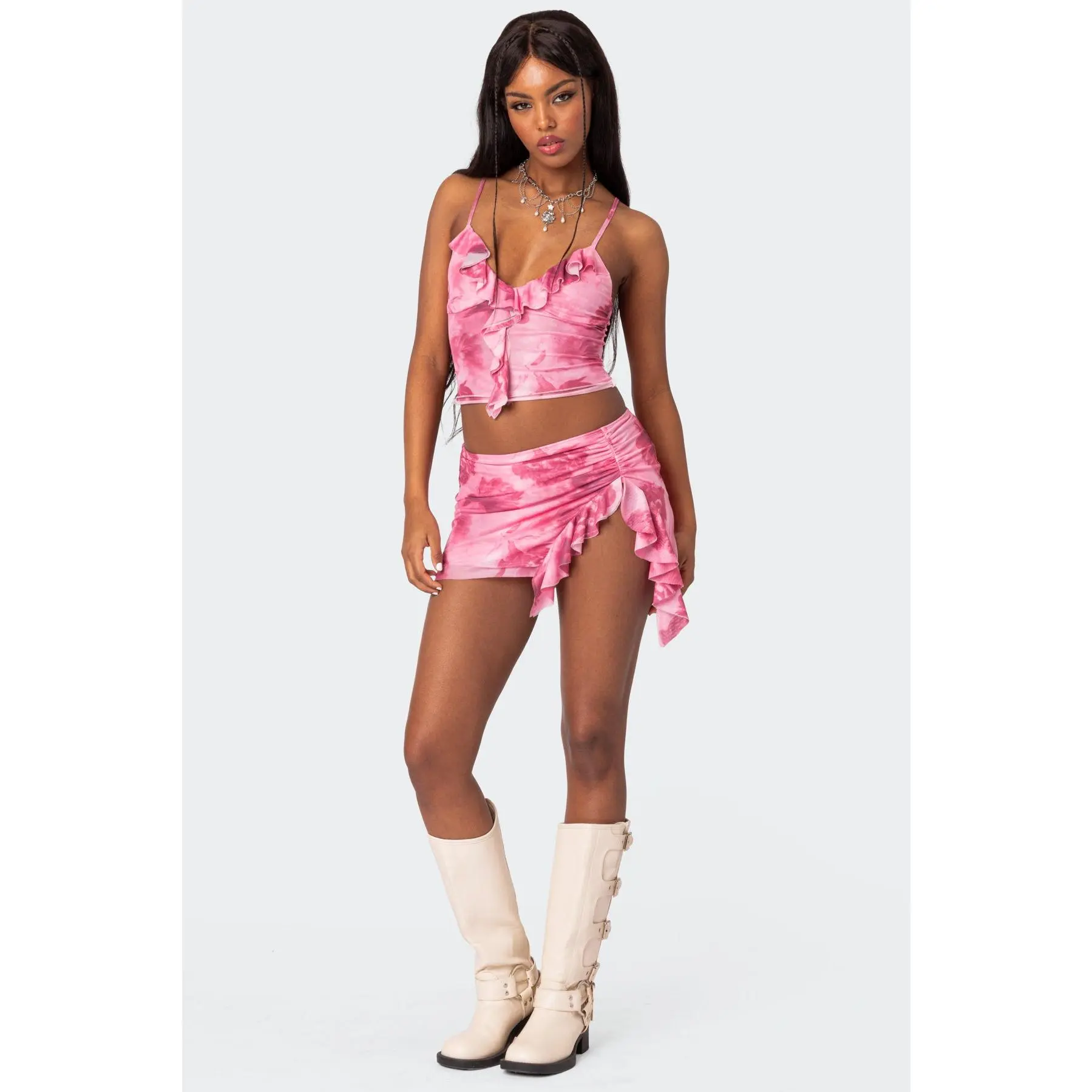 ·Cascading ruffle design