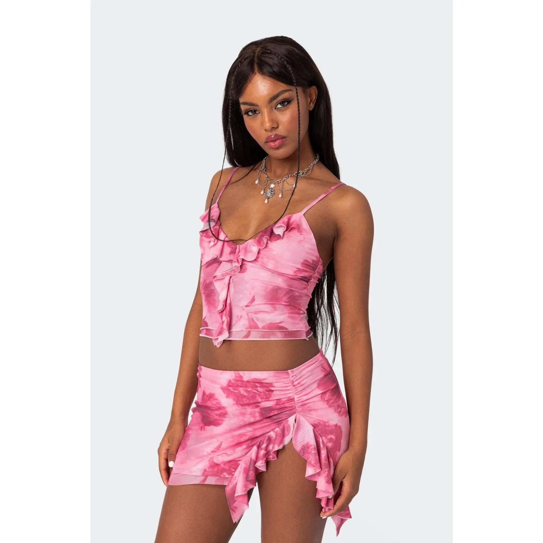 5. Wanda Printed Mesh Ruffled Tank Top