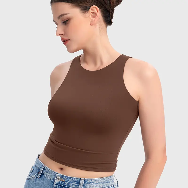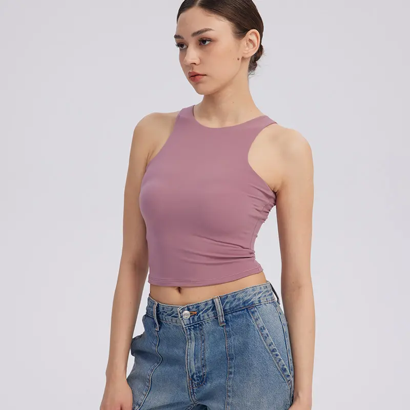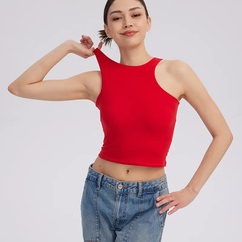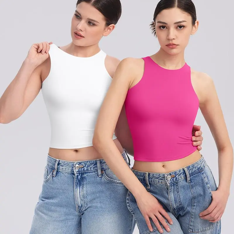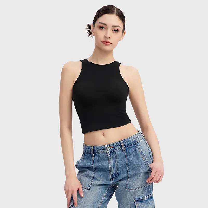 This sleeveless tank top features a high neck, racerback, and navel-exposed length. It combines classic style with a fashionable cut. Perfect for sweet and cool girls, it's a must-have crop top for various occasions. Elevate your wardrobe with this versatile piece.