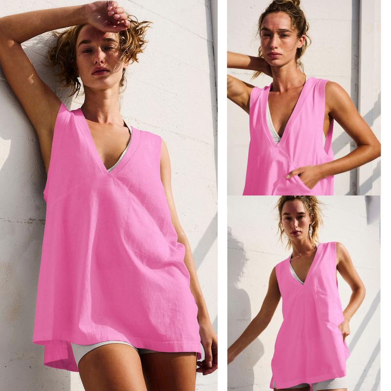 This solid-color, sleeveless top boasts a deep V-neck and side seam slit detail. The longline silhouette extends below the natural waist, adding a stylish touch. A patch pocket at the front offers practicality. Ideal for gym clothes and athletic running. 🏋️♀️