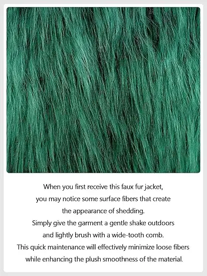 When you first receive this faux fur jacket, you may notice some surface fibers that create the appearance of shedding. This is normal with premium faux fur. Simply give the garment a gentle shake outdoors and lightly brush with a wide-tooth comb. This quick maintenance will effectively minimize loose fibers while enhancing the plush smoothness of the material