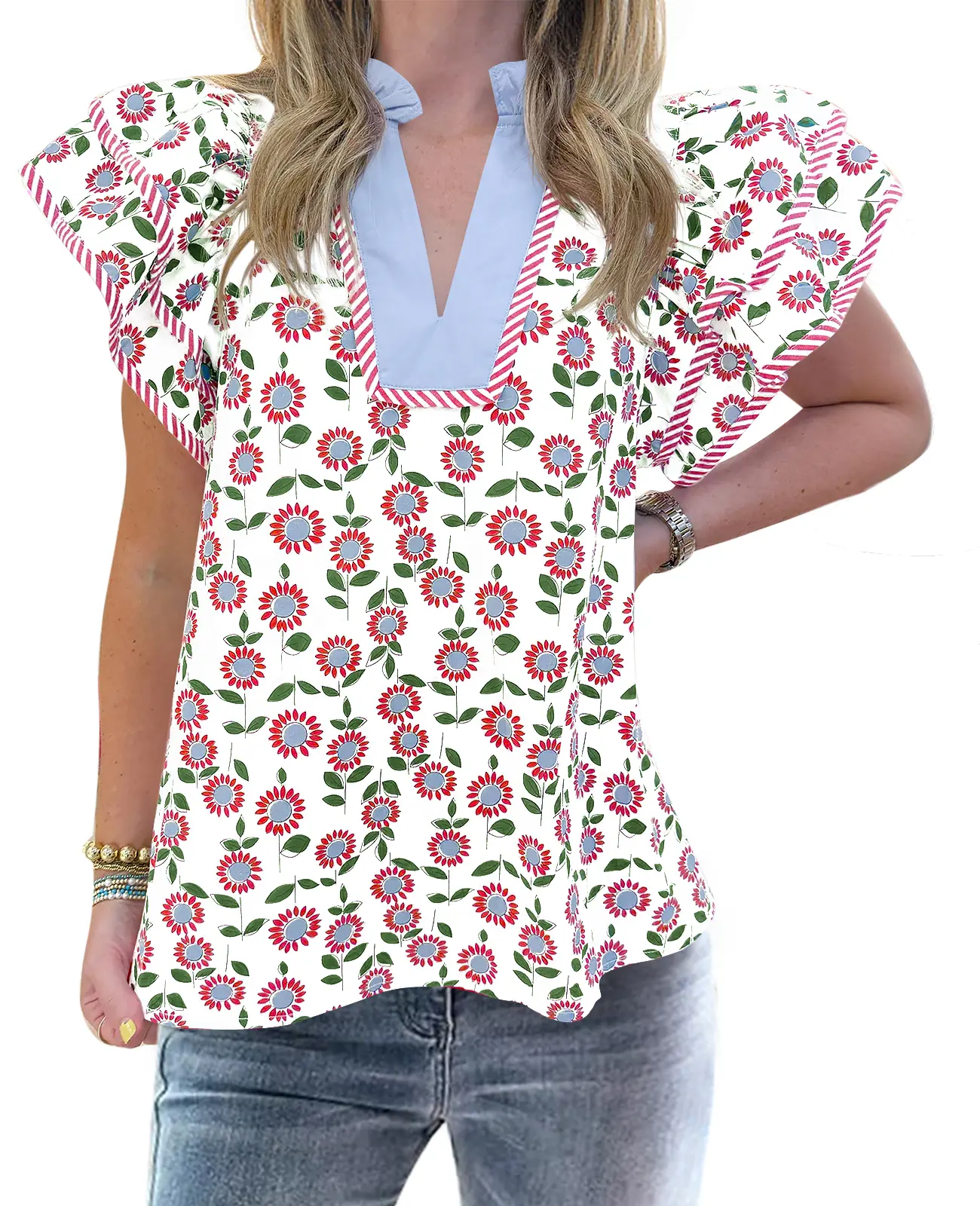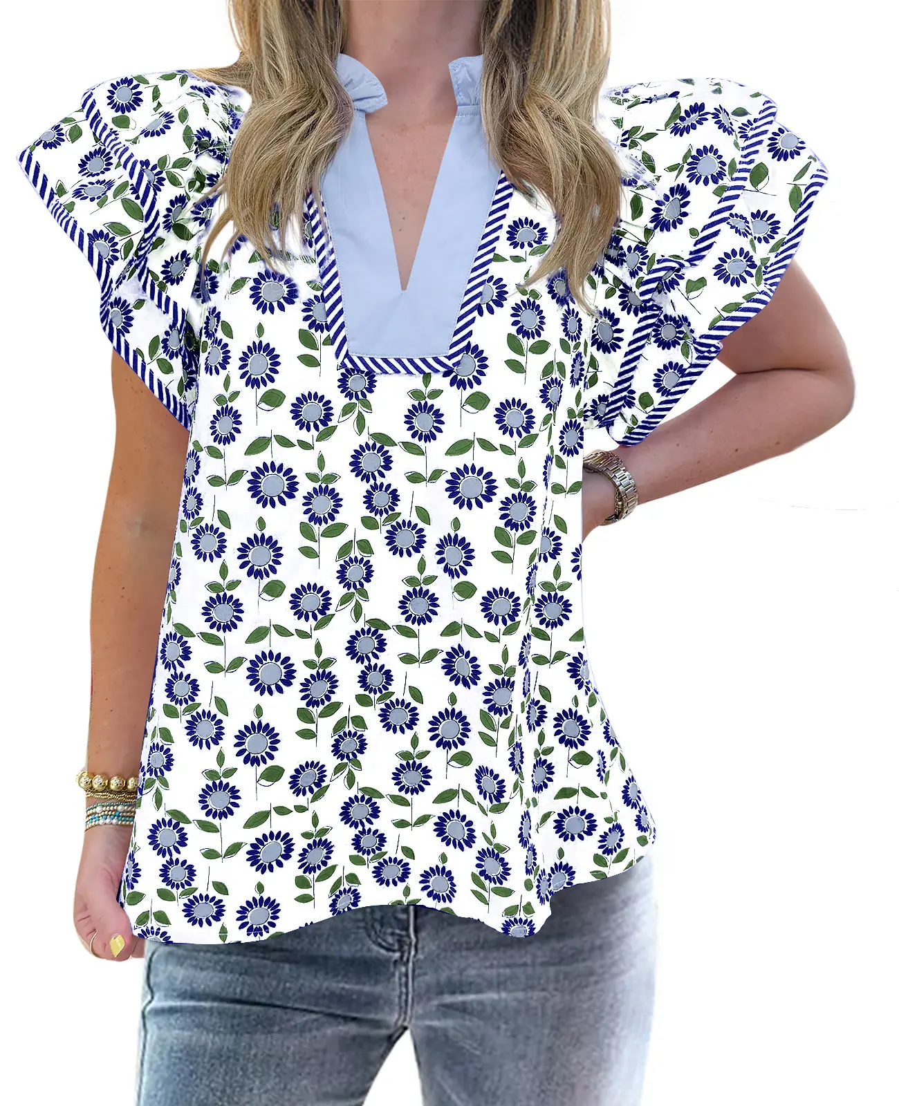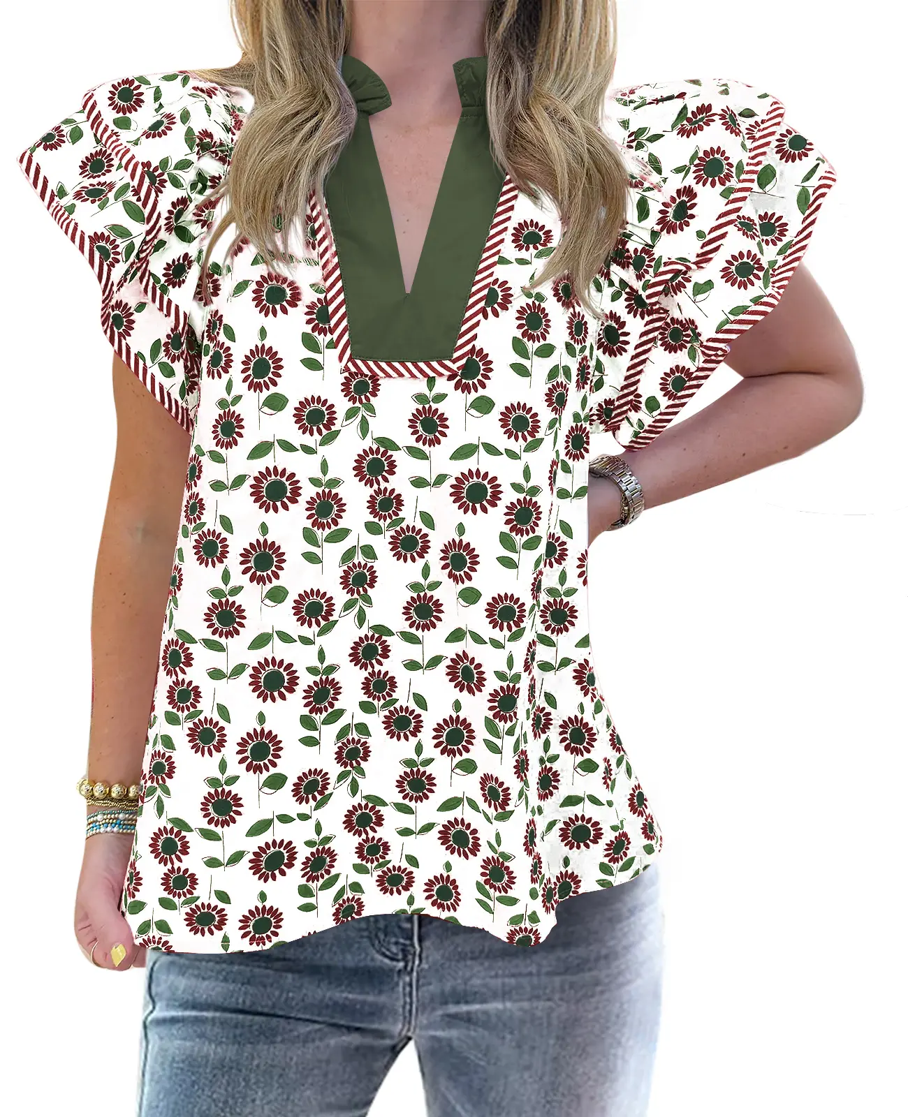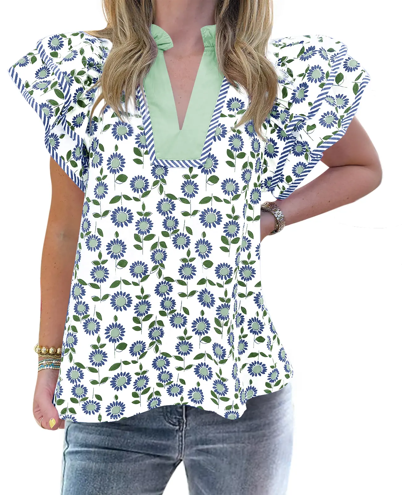 TANKANEO Women’s Floral V Neck Flutter Sleeve Blouse