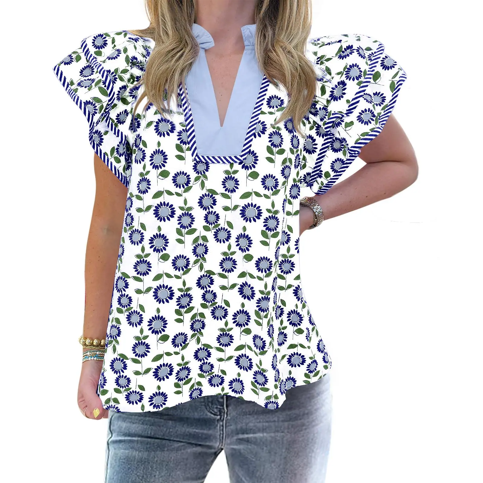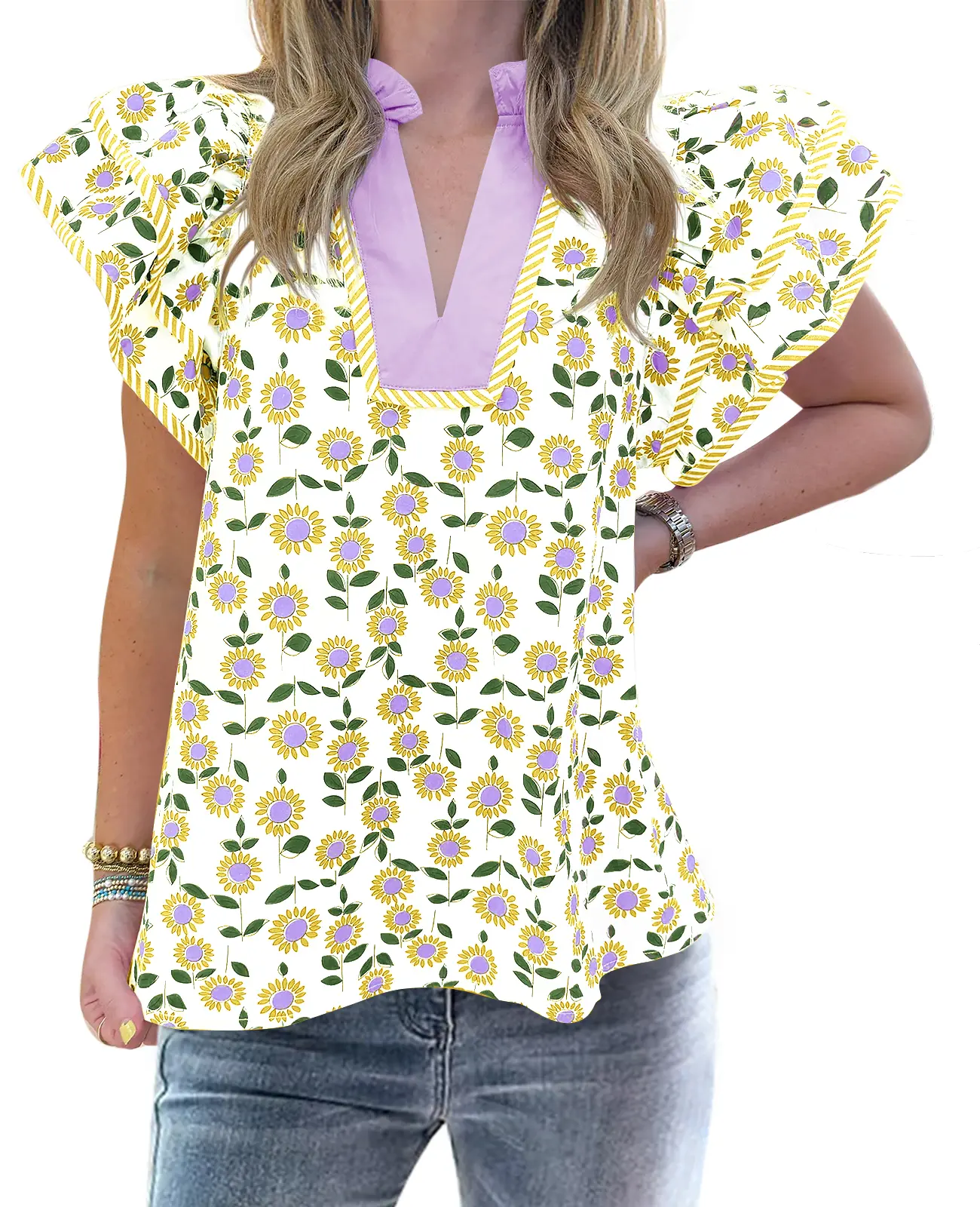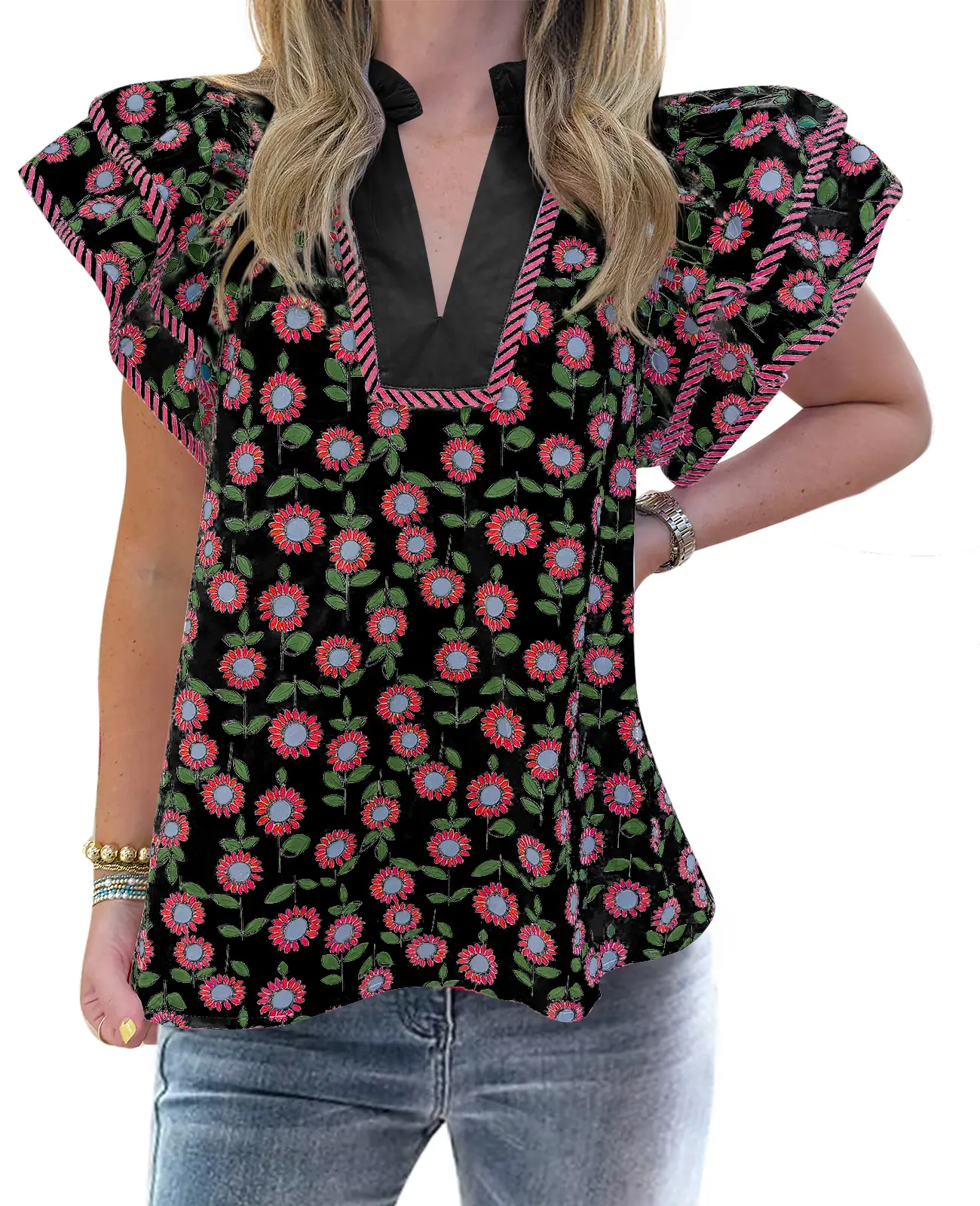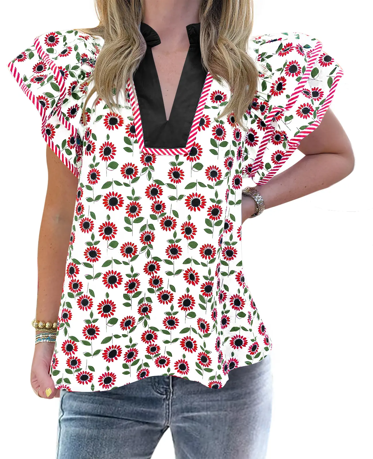 TANKANEO Women’s Floral V Neck Flutter Sleeve Blouse