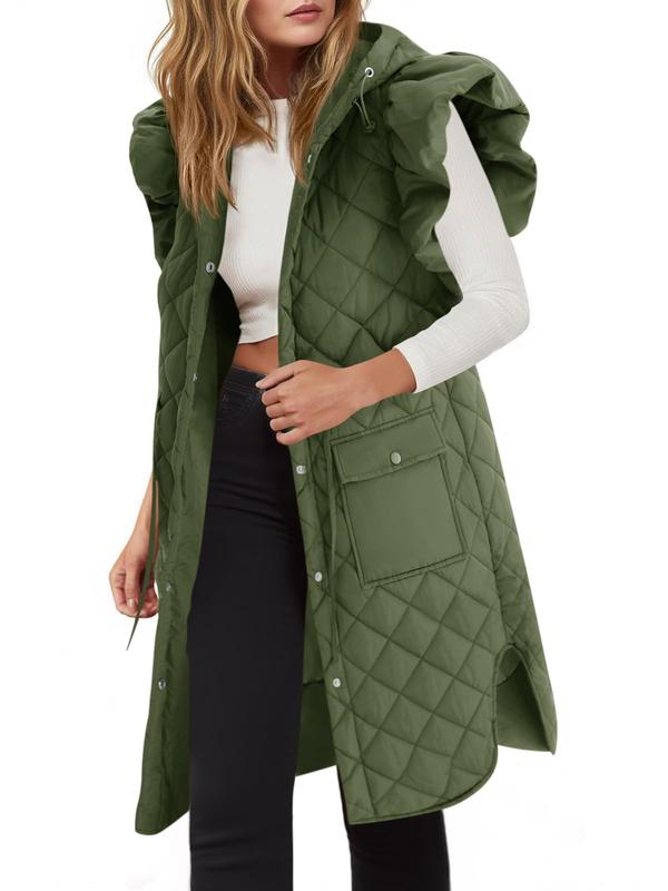 Features: Ruffled hooded long cotton vest. Solid color, stylish appearance, loose fit, Hood with drawstring, quilted cotton jacket loose silhouette, drawstring waist and snap front closure, front patch pockets and rounded hem.
