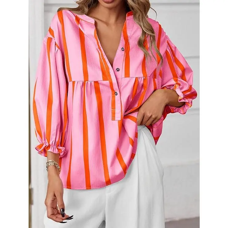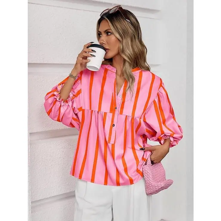 Trendy Design: Women blouse unique striped and button v neck design make you so special in the crowd. 3/4 puff sleeve with pleated details, elastic cuffs, back curved hem, swing shirts, loose fit, peplum tops. Comfortable fit style making it an ideal choice for both work and leisure