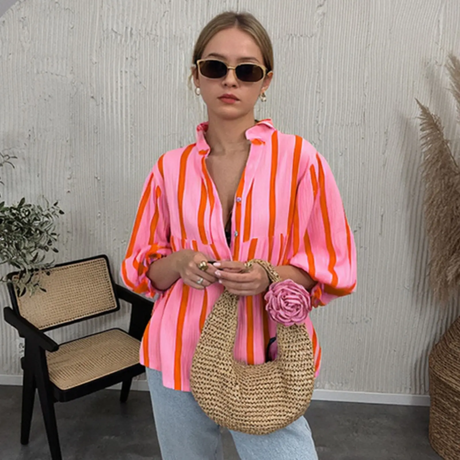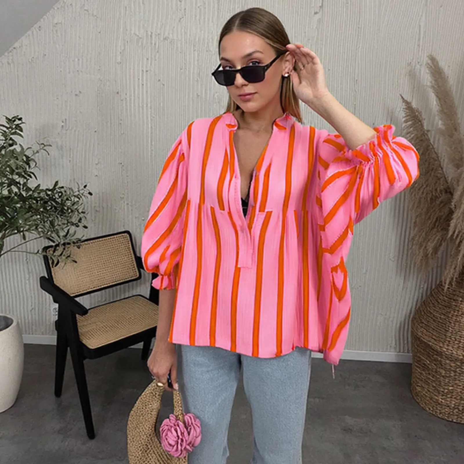 Made of 100% polyester, this blouse is soft, lightweight, and smooth. It offers a comfortable and breathable fit, perfect for all-day wear. The oversized style ensures a loose fit; order one size down for a snug fit. 🌿
