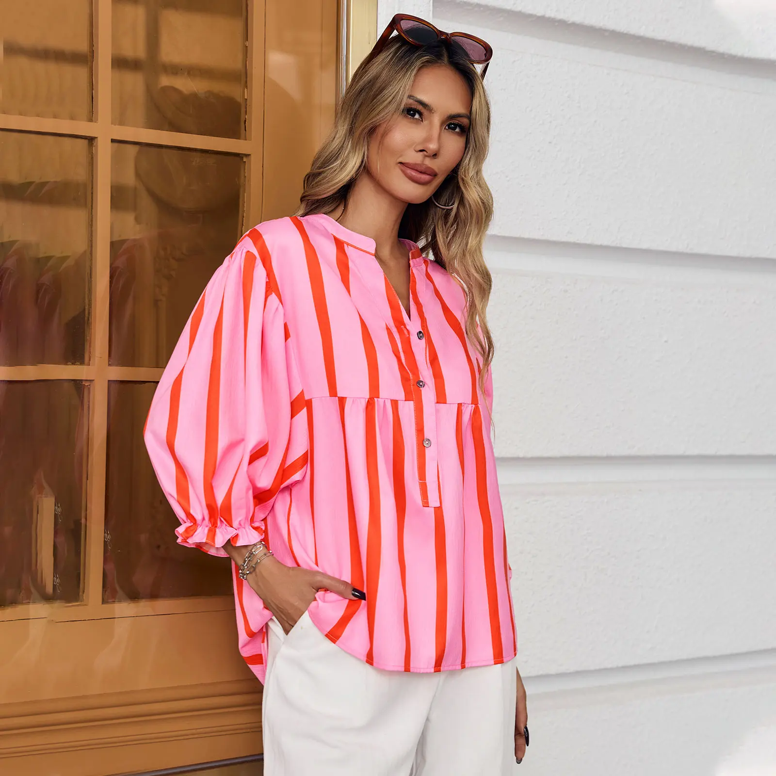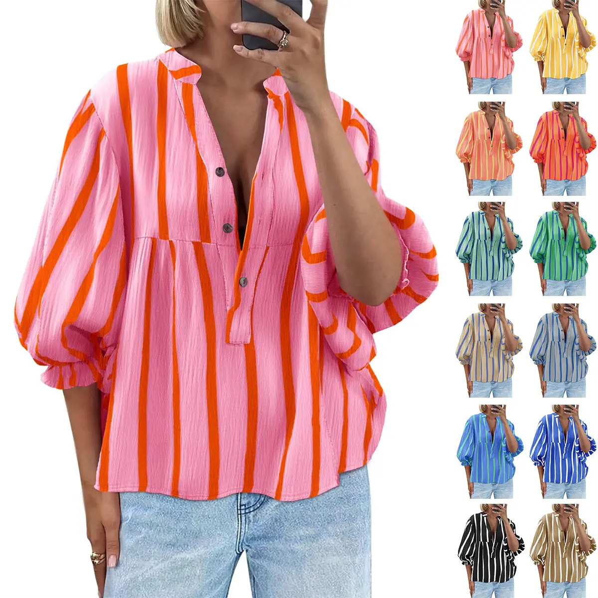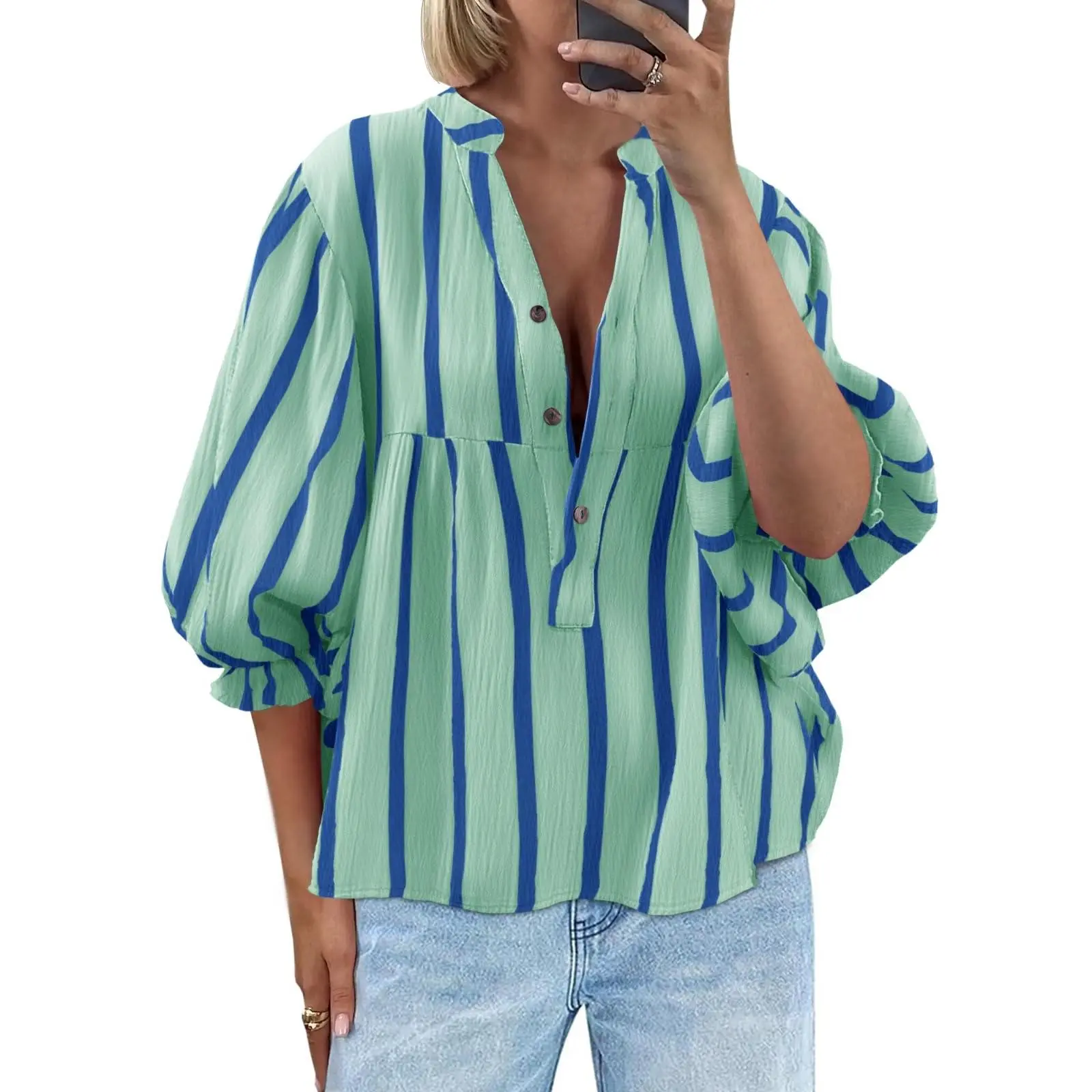 ·Unique striped and button V-neck design makes you stand out.