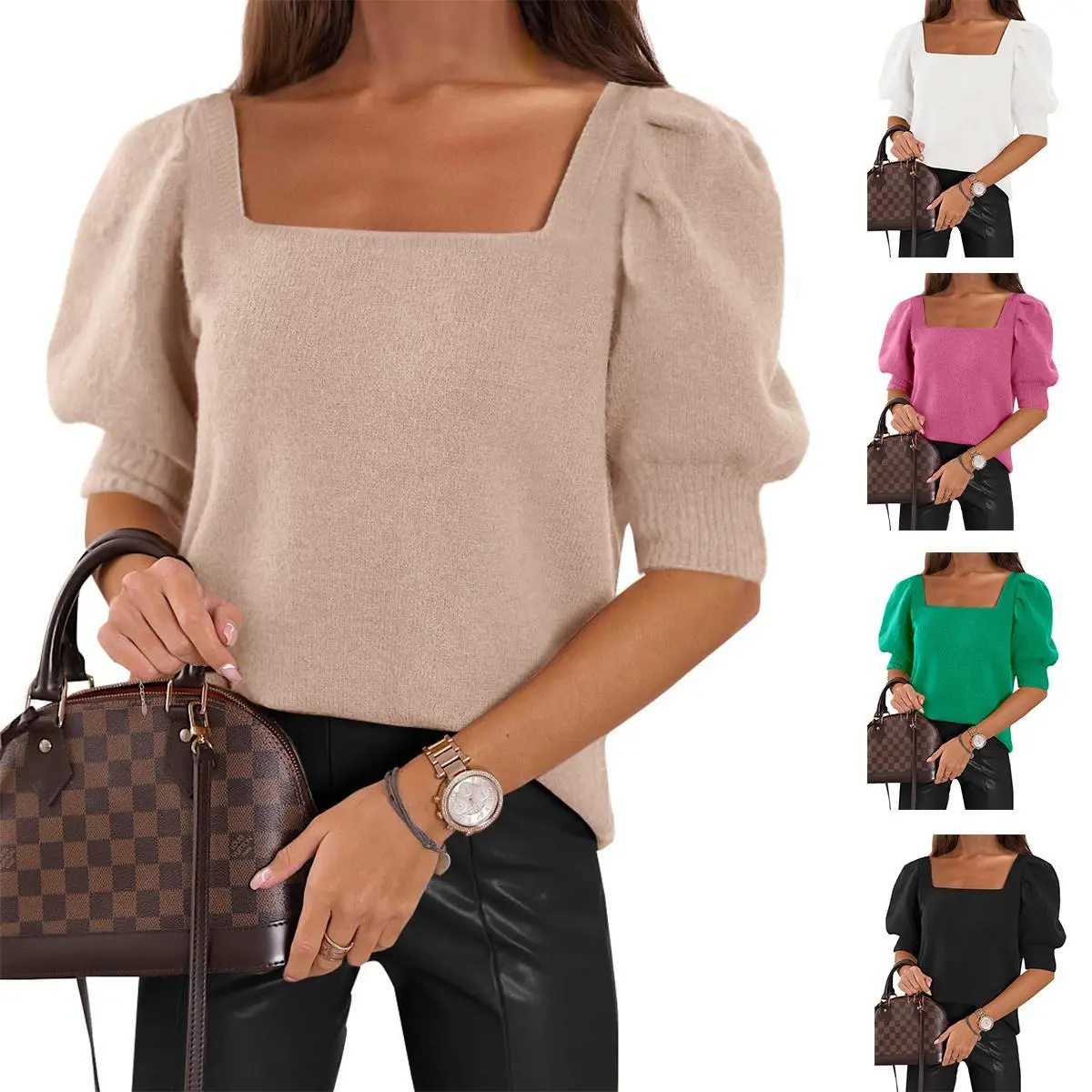 ·FEATURE: Women's summer tops, v neck/square neck, lantern short sleeve, knitted, solid color, loose fit style, dressy casual and lightweight design.