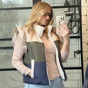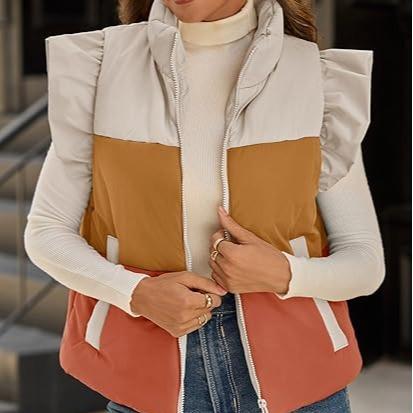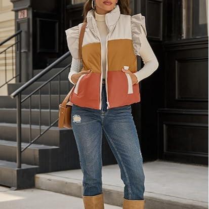 Features: This stylish puffer jacket features a stand collar, cute ruffle sleeveless, zip-up, color block, and two side pockets for essentials—combining practicality with trendy flair.