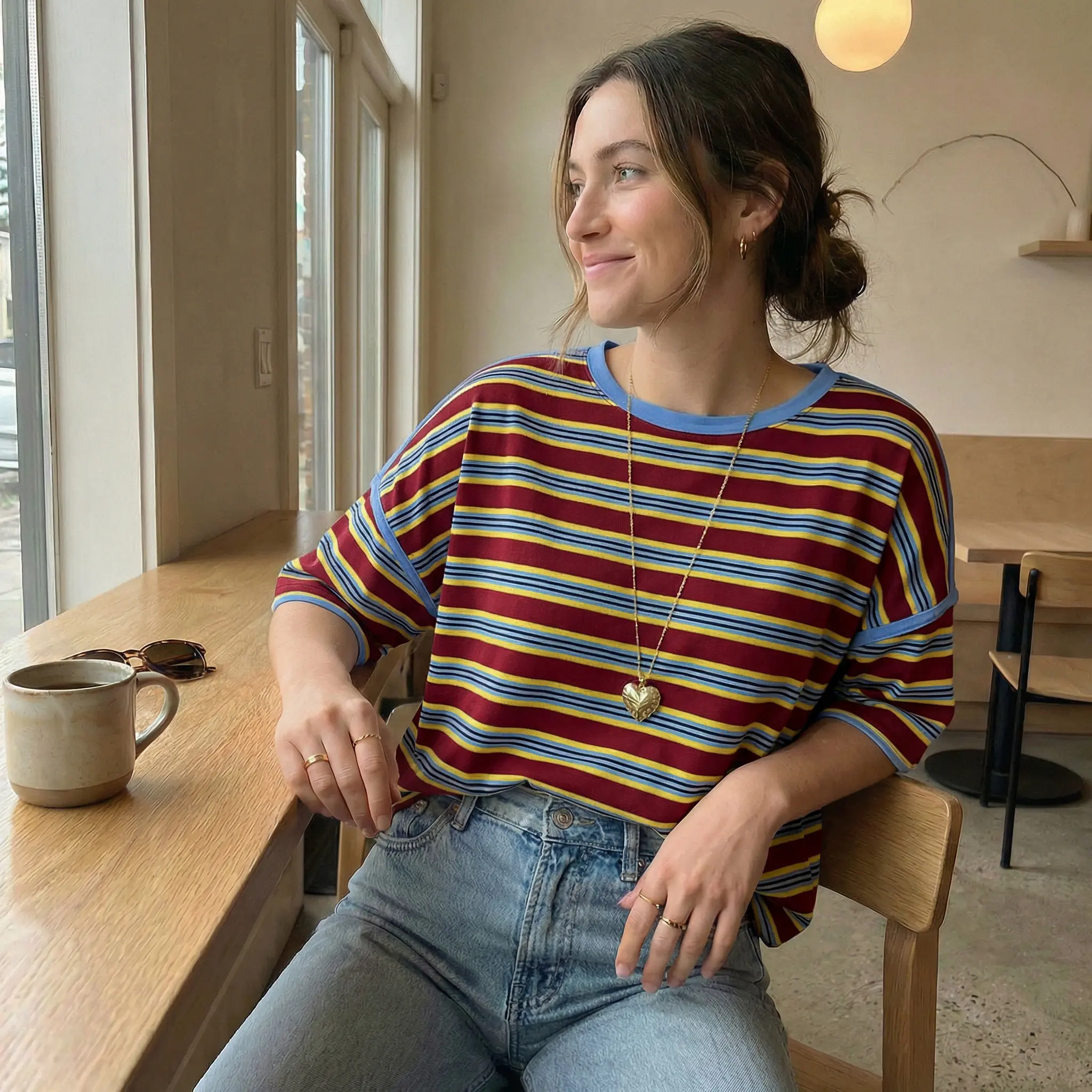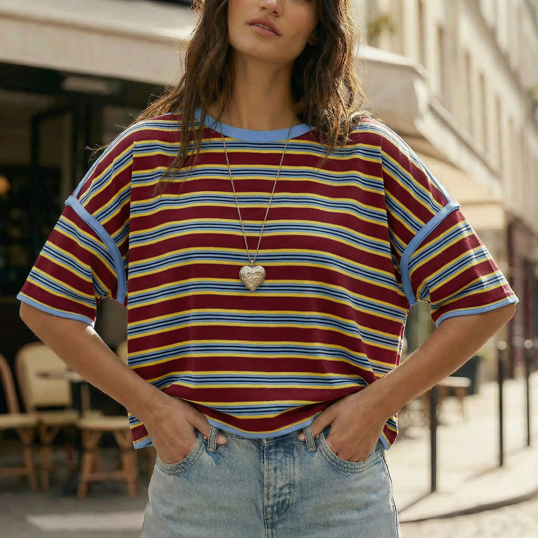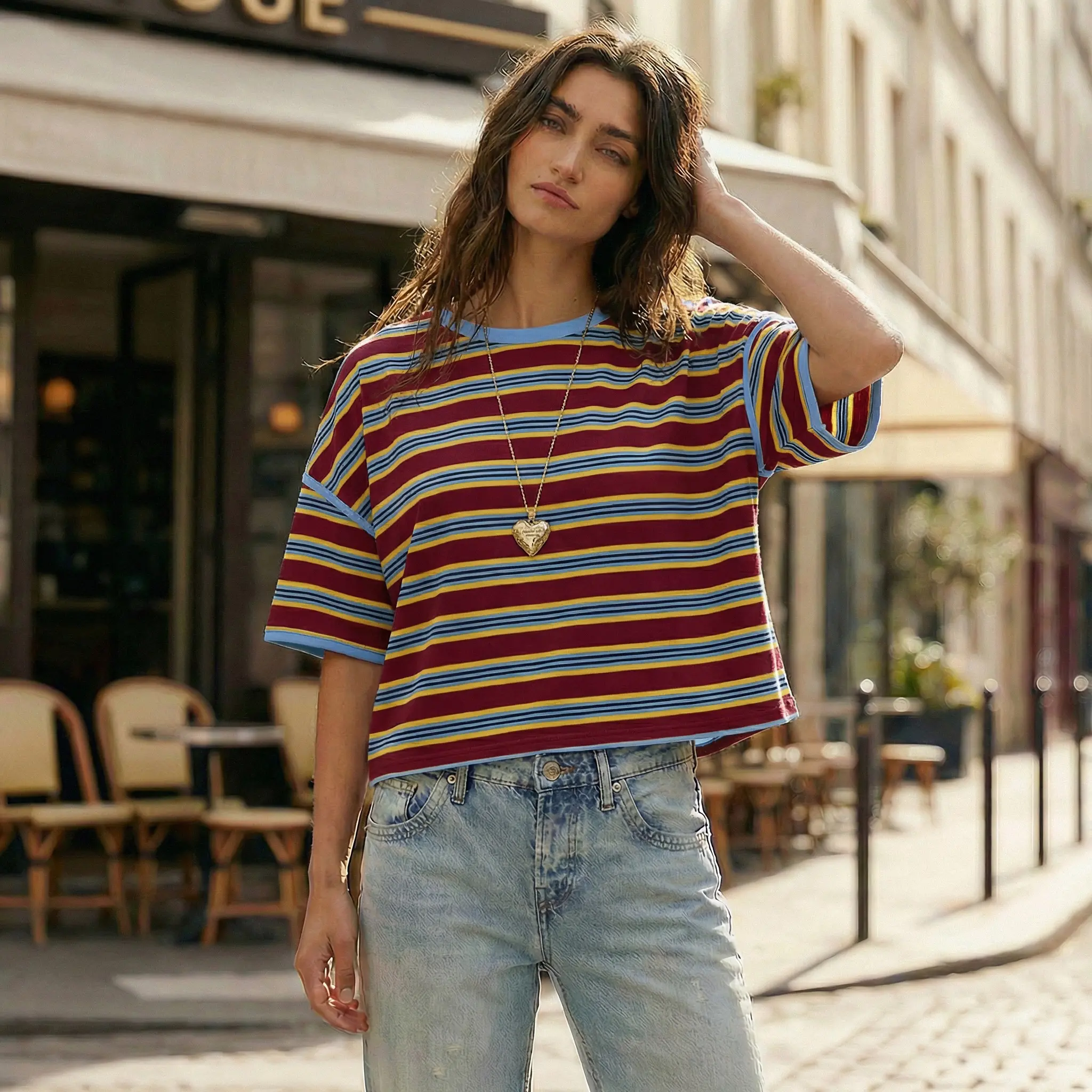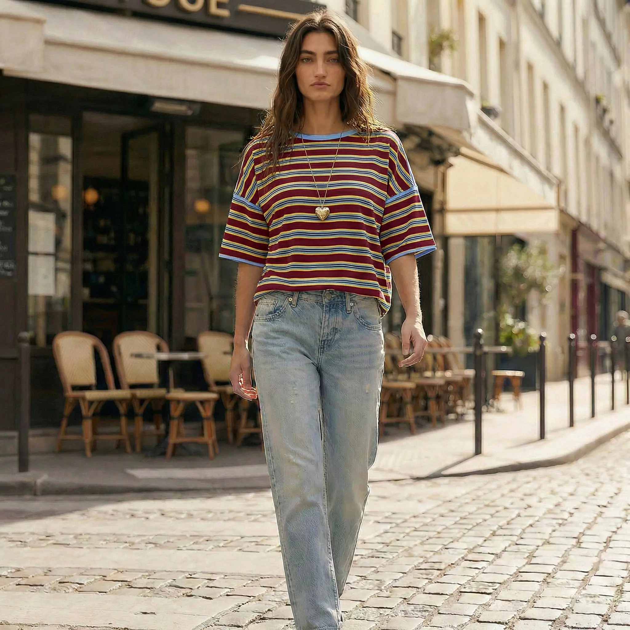 Pair this tee with jeans for a casual look. The loose fit and striped design make it a versatile choice for various occasions. Perfect for layering or wearing alone. 🌟