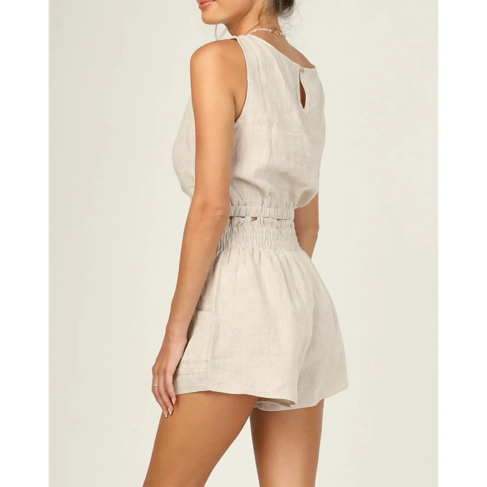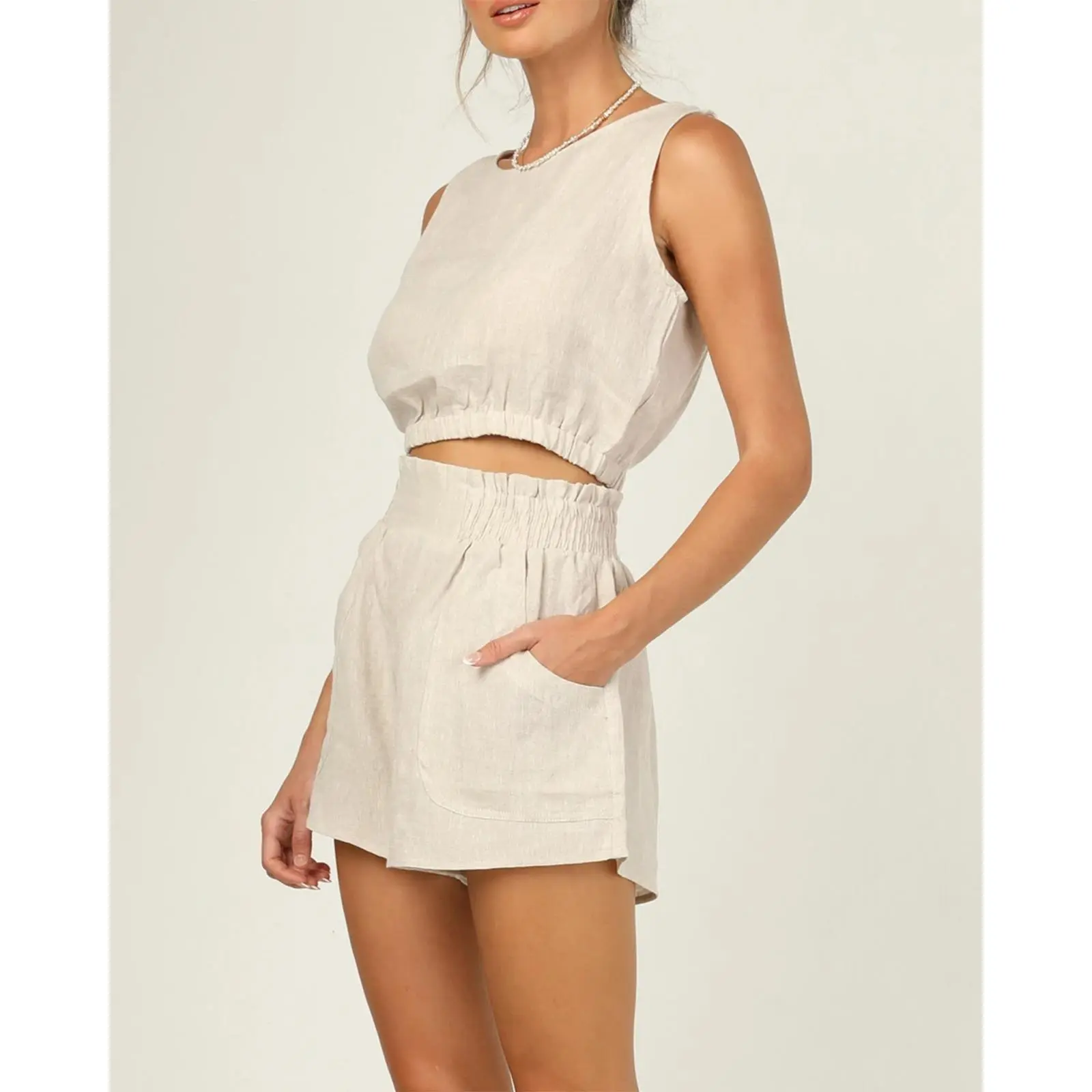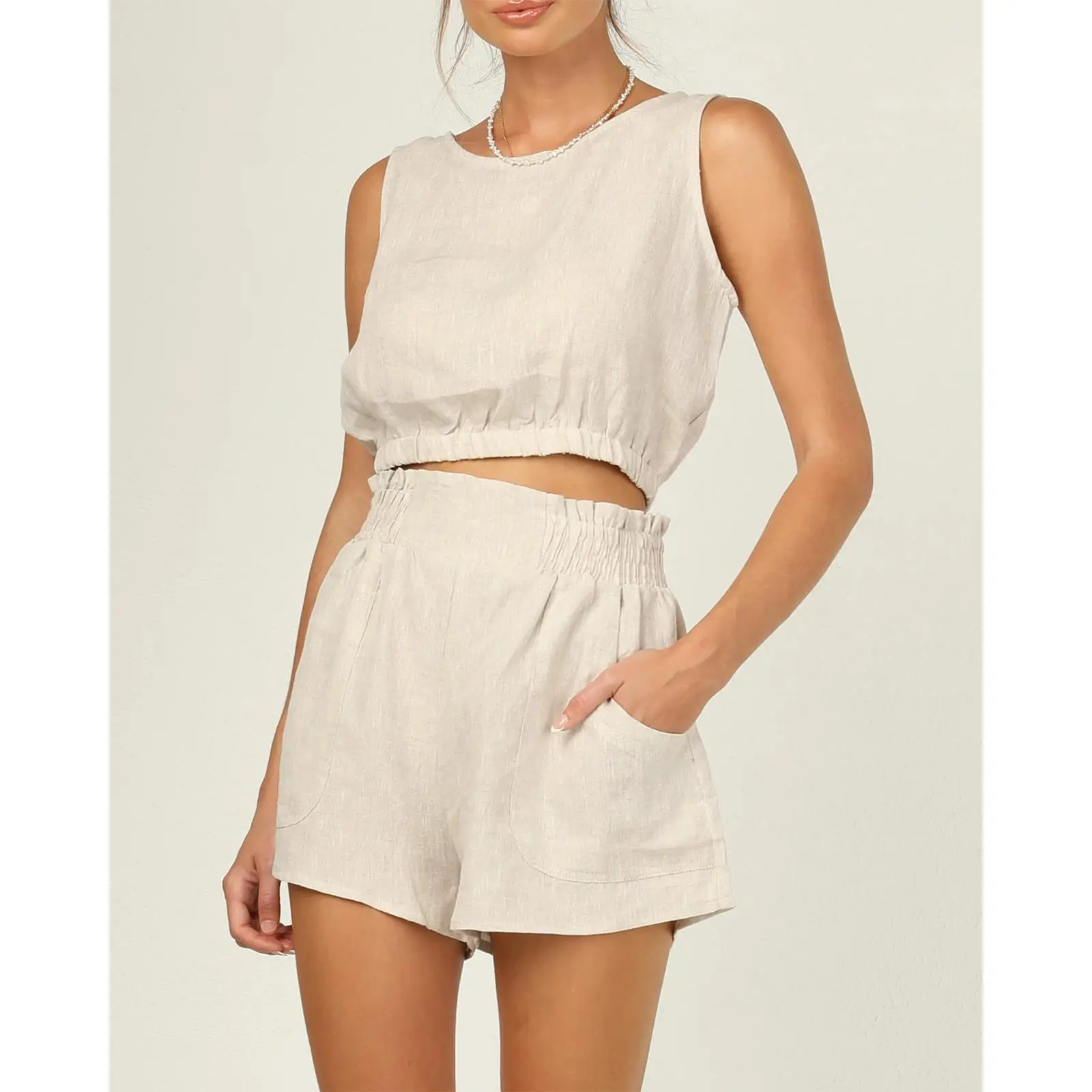 ·Features: Solid color, relaxed fit, sleeveless, crewneck, back button closure with keyhole, high waist, elastic hem and waistband, side pockets, cropped vest shirts and shorts pants, simple casual two piece clothing sets