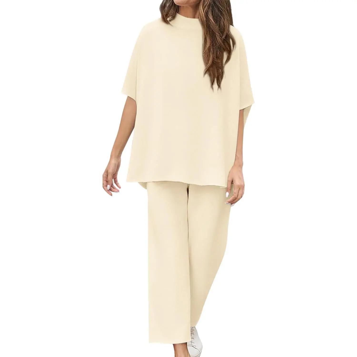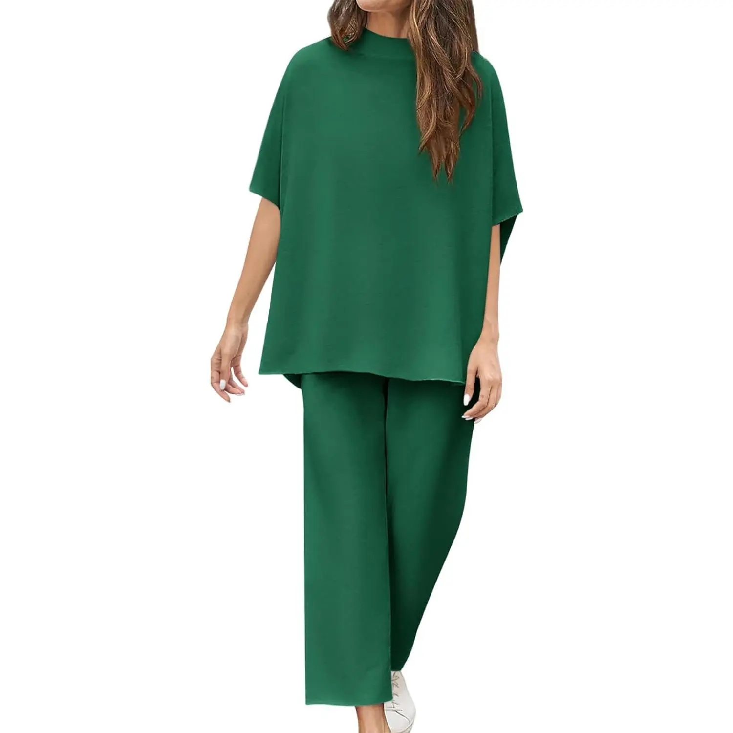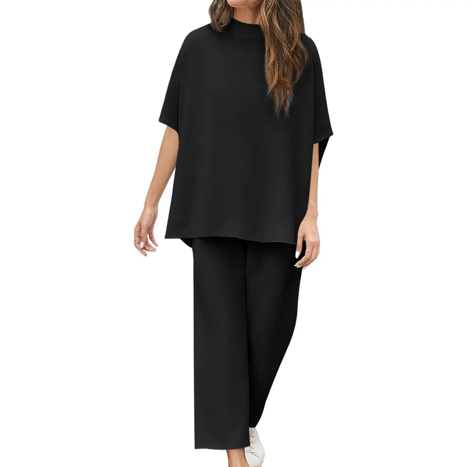 Women's Two Piece Outfits 3/4 Batwing Sleeve Capelet Pullover Top Wide Leg Pants