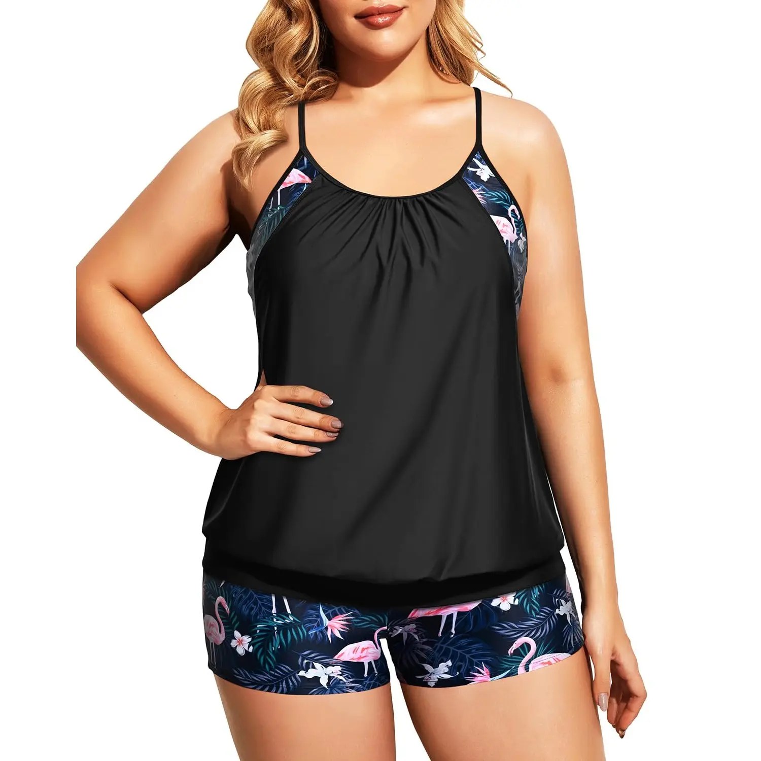 The bathing suit is adorable! The fabric quality was great and the colors were vibrant. The only thing that surprised me a little was how wide the band was at the bottom of the shirt. I thought it was going to be more loose and flowing but the banded bottom keeps it very snug against you.