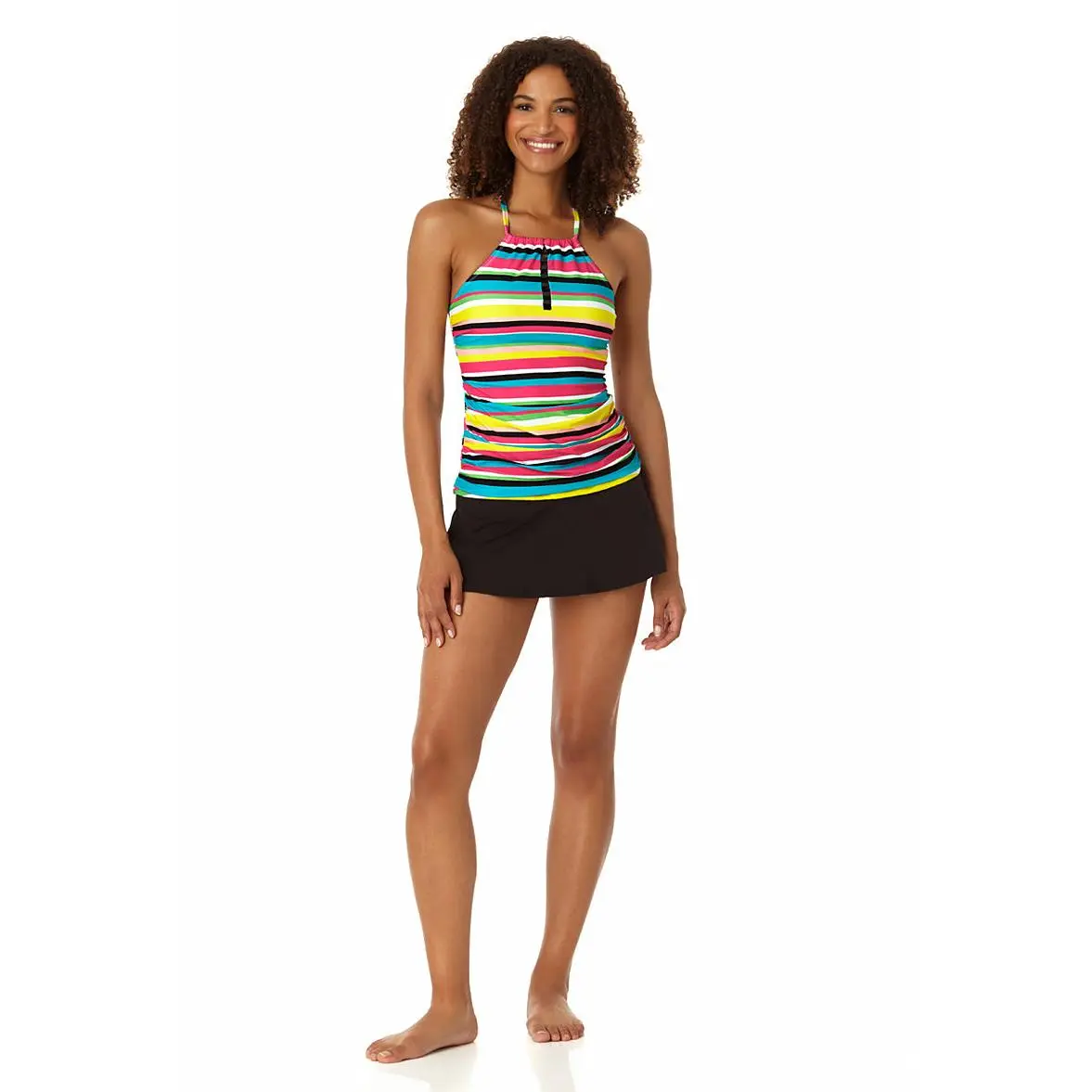 Stand out at the beach in vibrant style with this Center Tab High Neck Tankini Swim Top, which will give you a modern, trendy look. The swimsuit's flattering high neck cut will show off your shoulders, while the center tab is a stylish detail. This tankini swim top has adjustable straps and removable cups, providing comfortable support for your beach day activities. You'll have no problem looking stylish at the beach. Pair this with your favorite sunglasses for a colorful summer look!