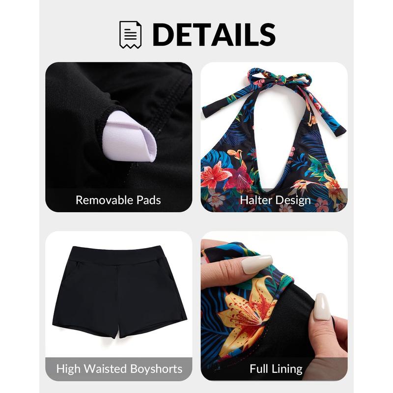 ·Two Piece Tankini: This two piece swimsuit with shorts features a v neck twist front, a halter self-tie, and removable padded cups for good bra support.