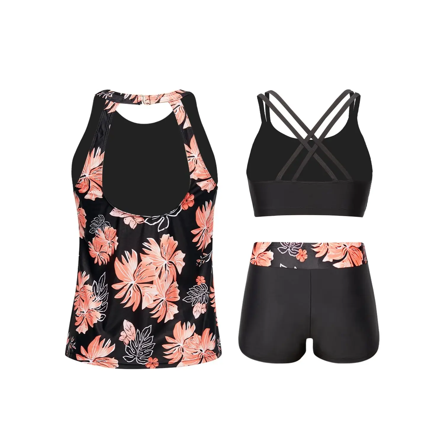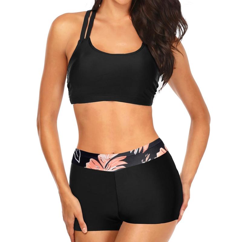 ·The three-piece tankini set includes a swim tank top, sports bra, and boy shorts, offering versatile styling options like a modest tankini or a single-piece bikini top with shorts.