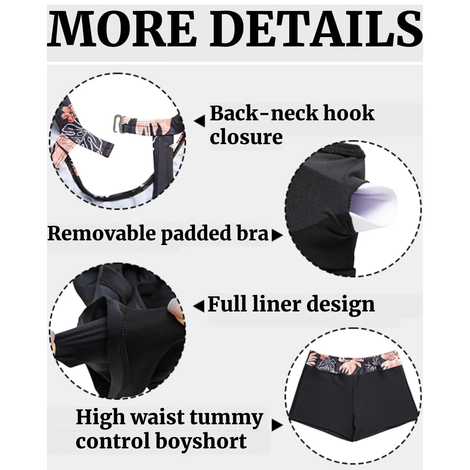 ·High neck three pieces bathing suits design with neck hook closure and padded push up bra for support and shape. The black floral backless tankini highlights your beach chic style and makes you more sexy, chic and alluring.