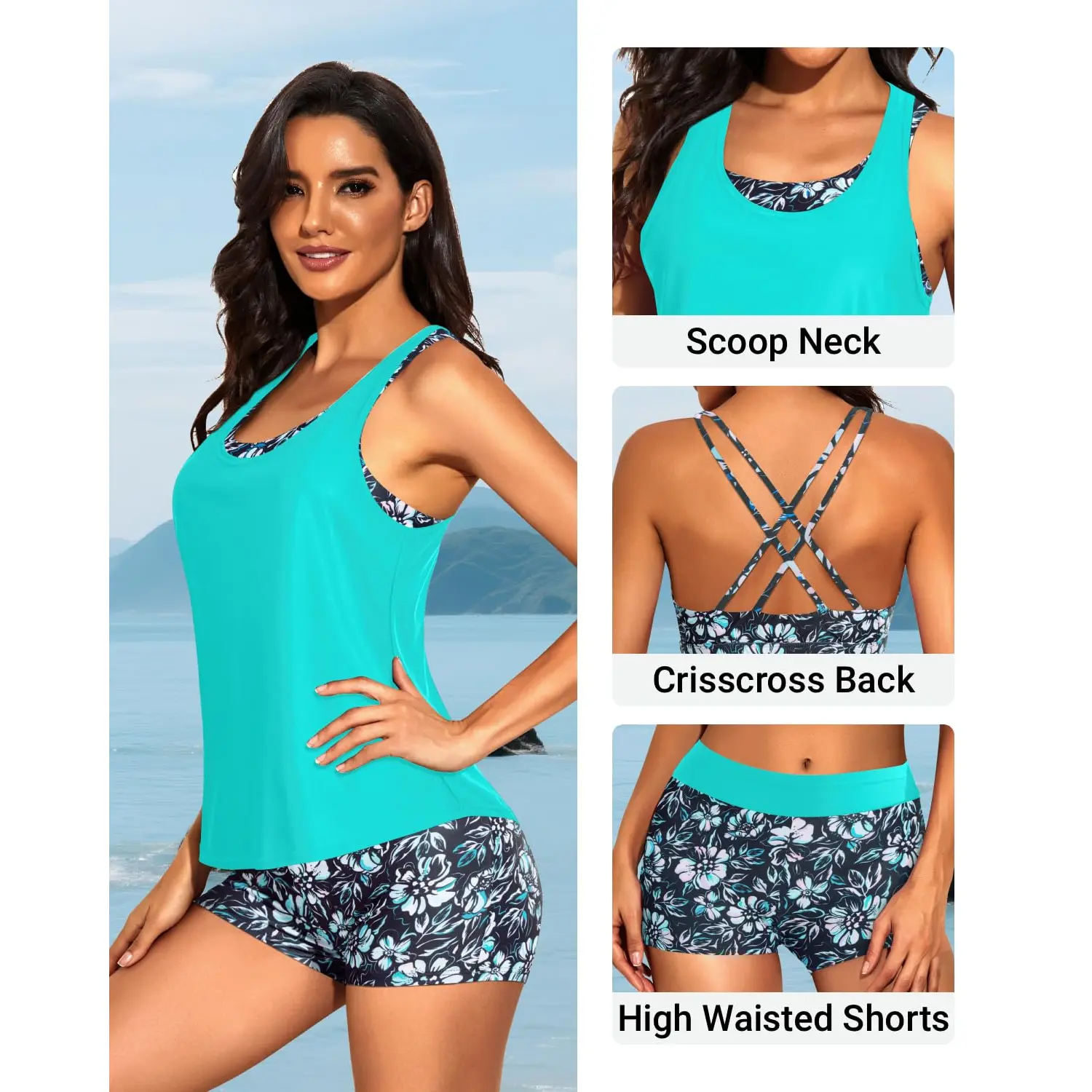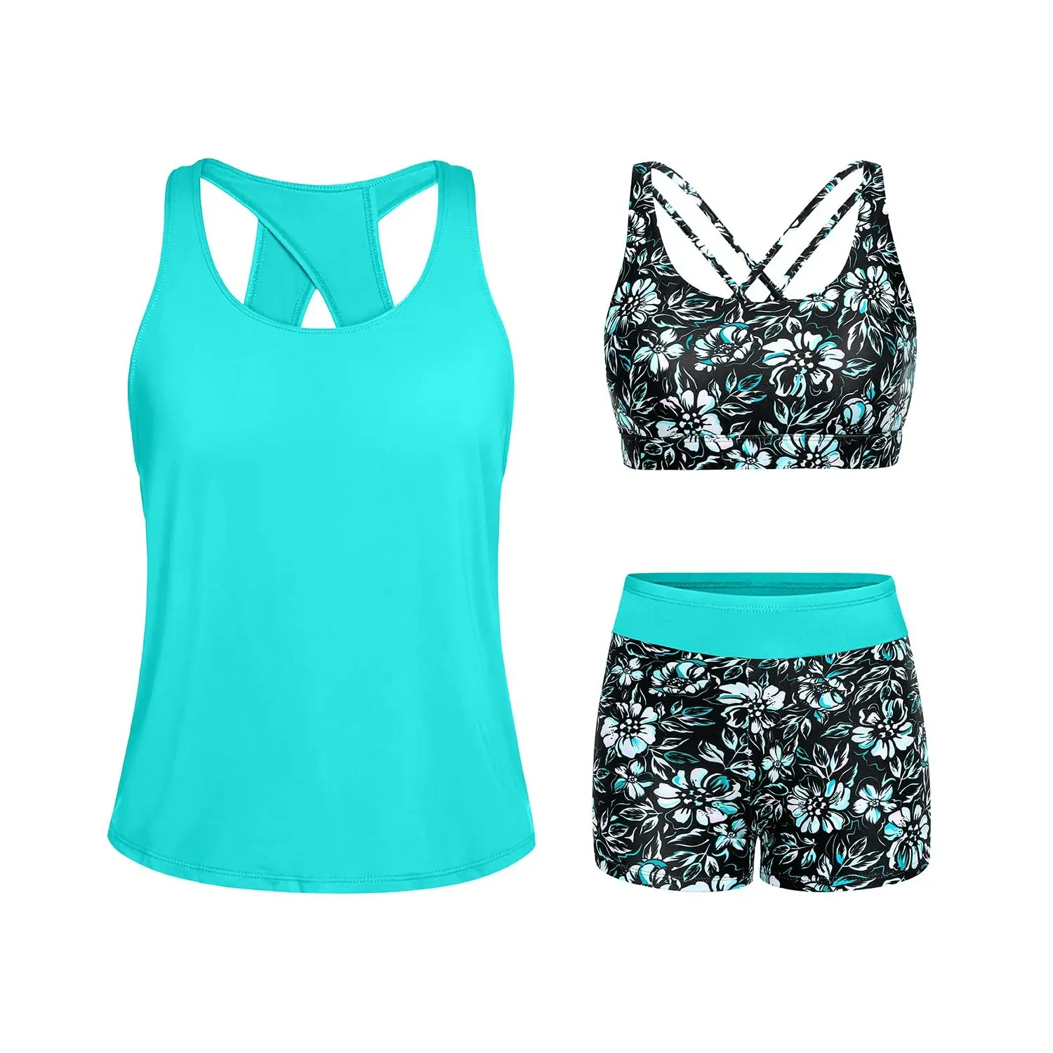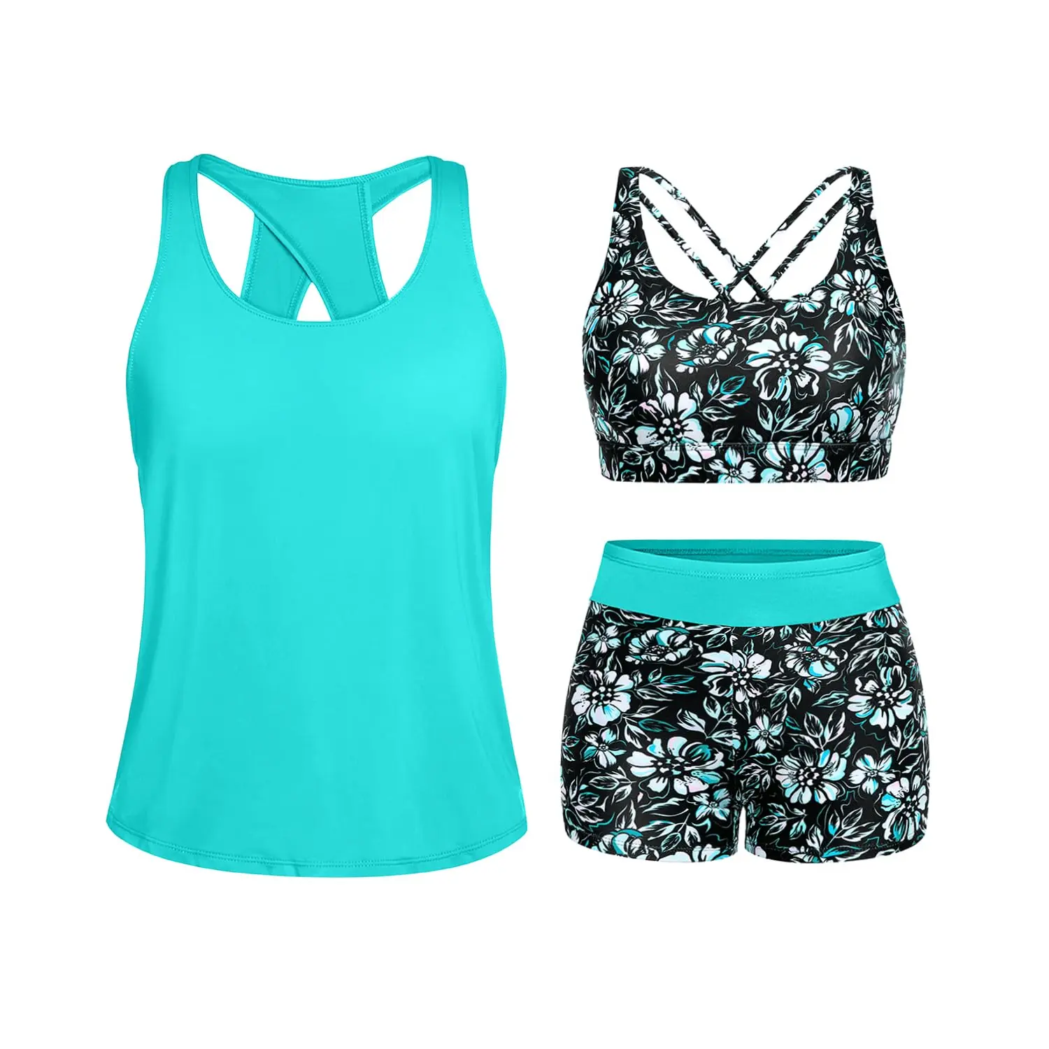 ·Tankini with shorts: Blue green three piece tankini bathing suit includes a swim tank top, sports bra, and boyshorts, which offers you two combinations as bikini with shorts or three-piece tankini set.
