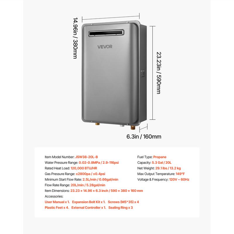 • Enjoy Instant Hot Water: This 5.3Gal, 120,000 BTU/h tankless water heater powered by propane, lets you and your family say goodbye to cold water and enjoy constant, comfortable hot water for showers and more