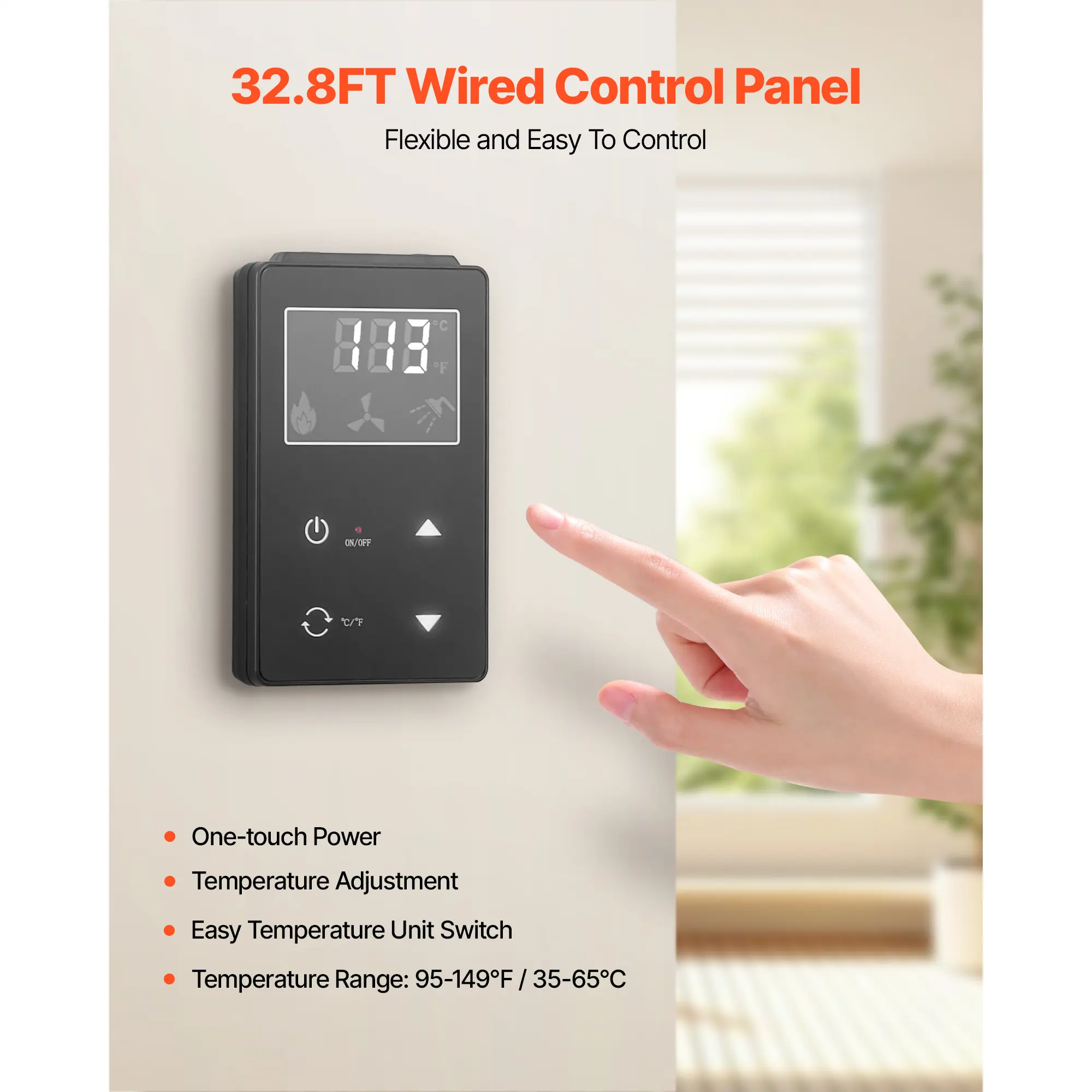 • Flexible Control: Equipped with a 32.8ft wired control panel, allowing easy adjustment of water temperature, one-touch on/off, temperature control, and unit switching for simple and convenient operation