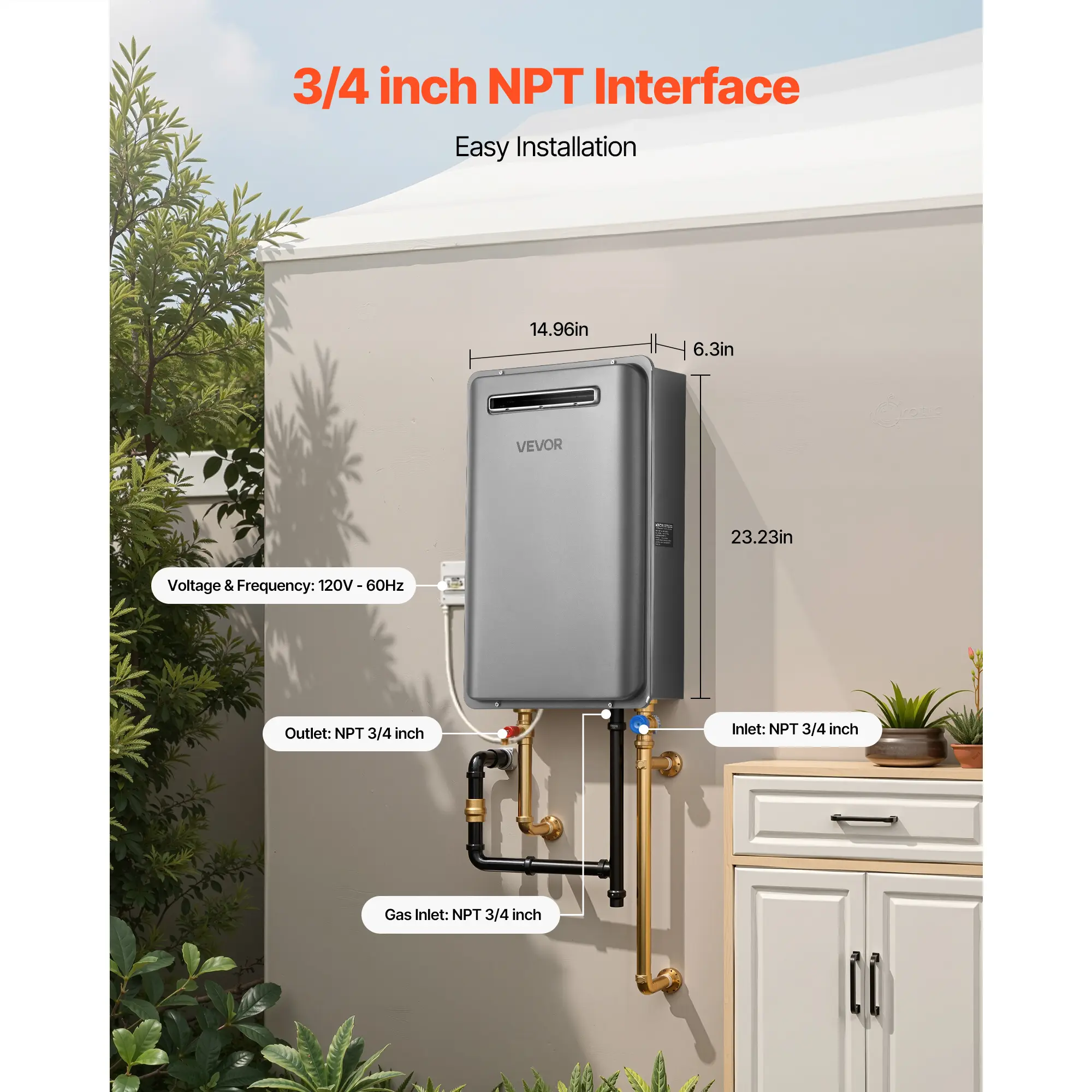 • Easy Installation: Uses a standard 3/4 inch NPT connector; the outdoor unit comes with a vent outlet for easy connection to a direct vent. This instant hot water heater is suitable for various installations, offering a simple and efficient setup