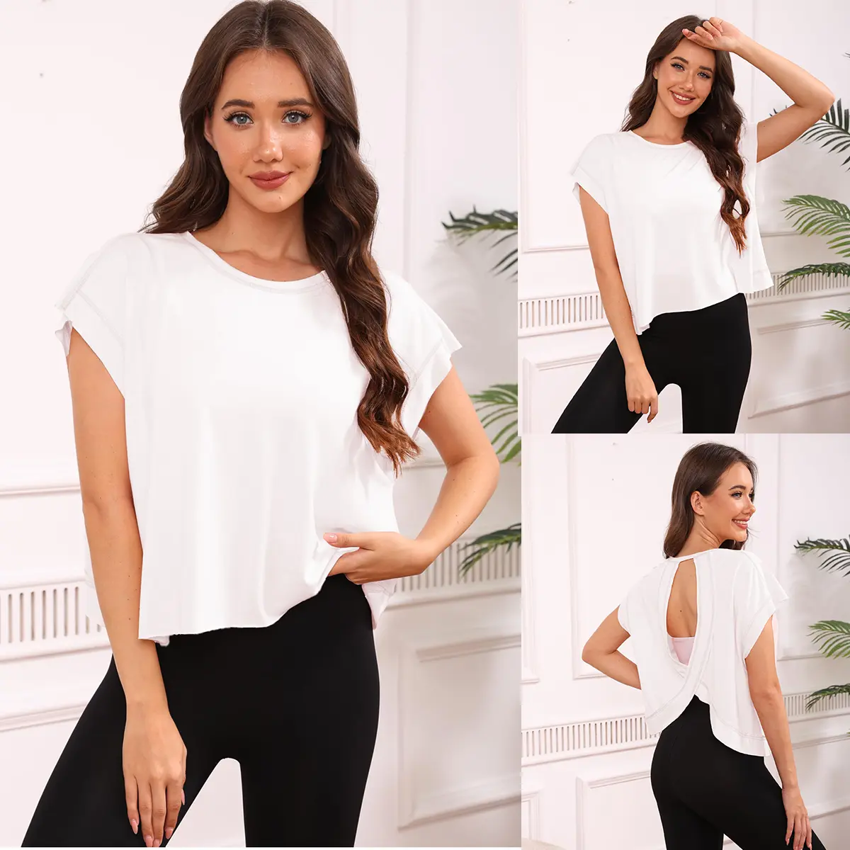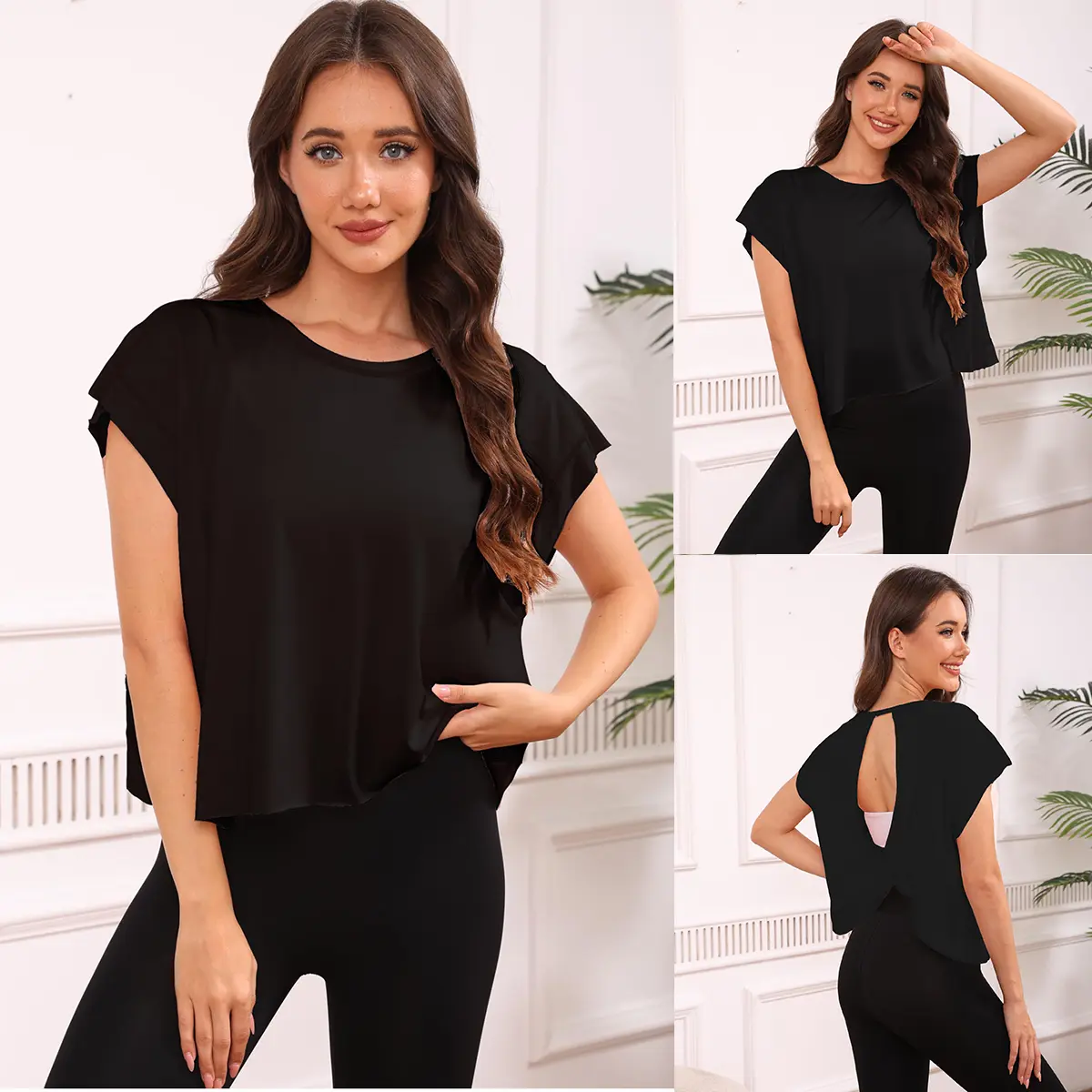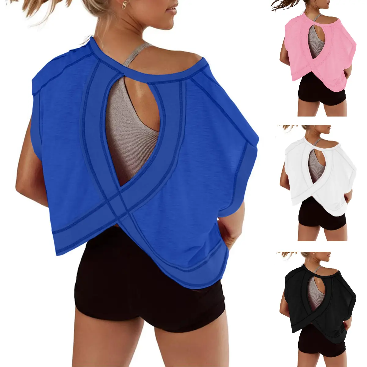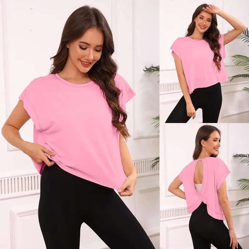 This short sleeve workout top features dropped sleeves, a wide neckline, ribbed wrist details, and a wrapped cutout back. The open back design not only adds a trendy, chic touch but also allows better airflow to keep you cool during workouts .
