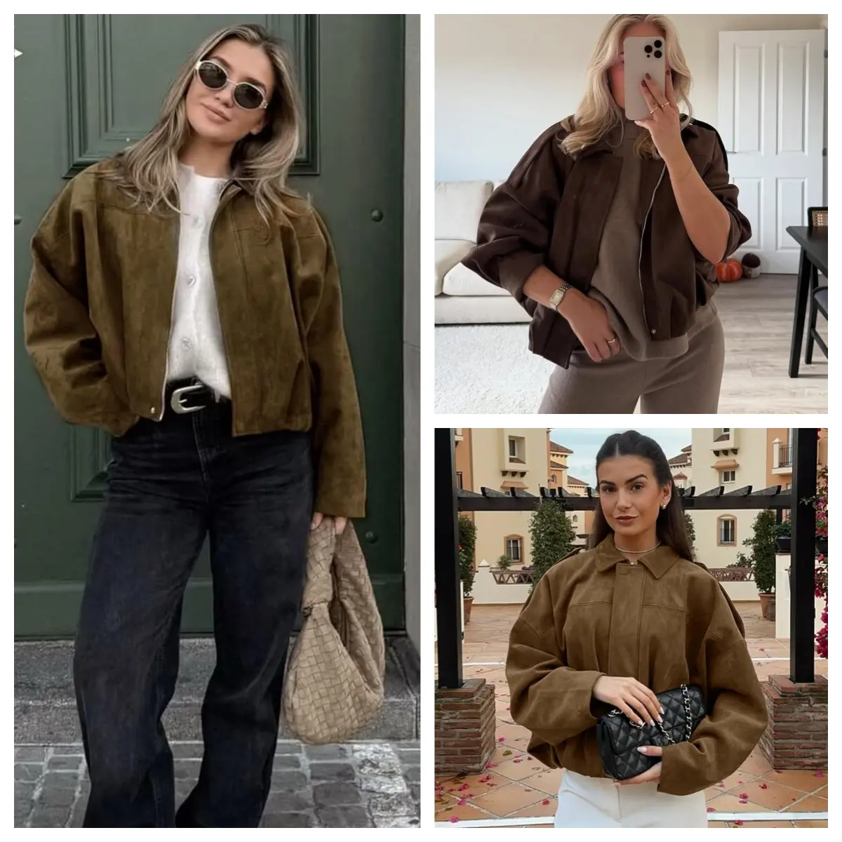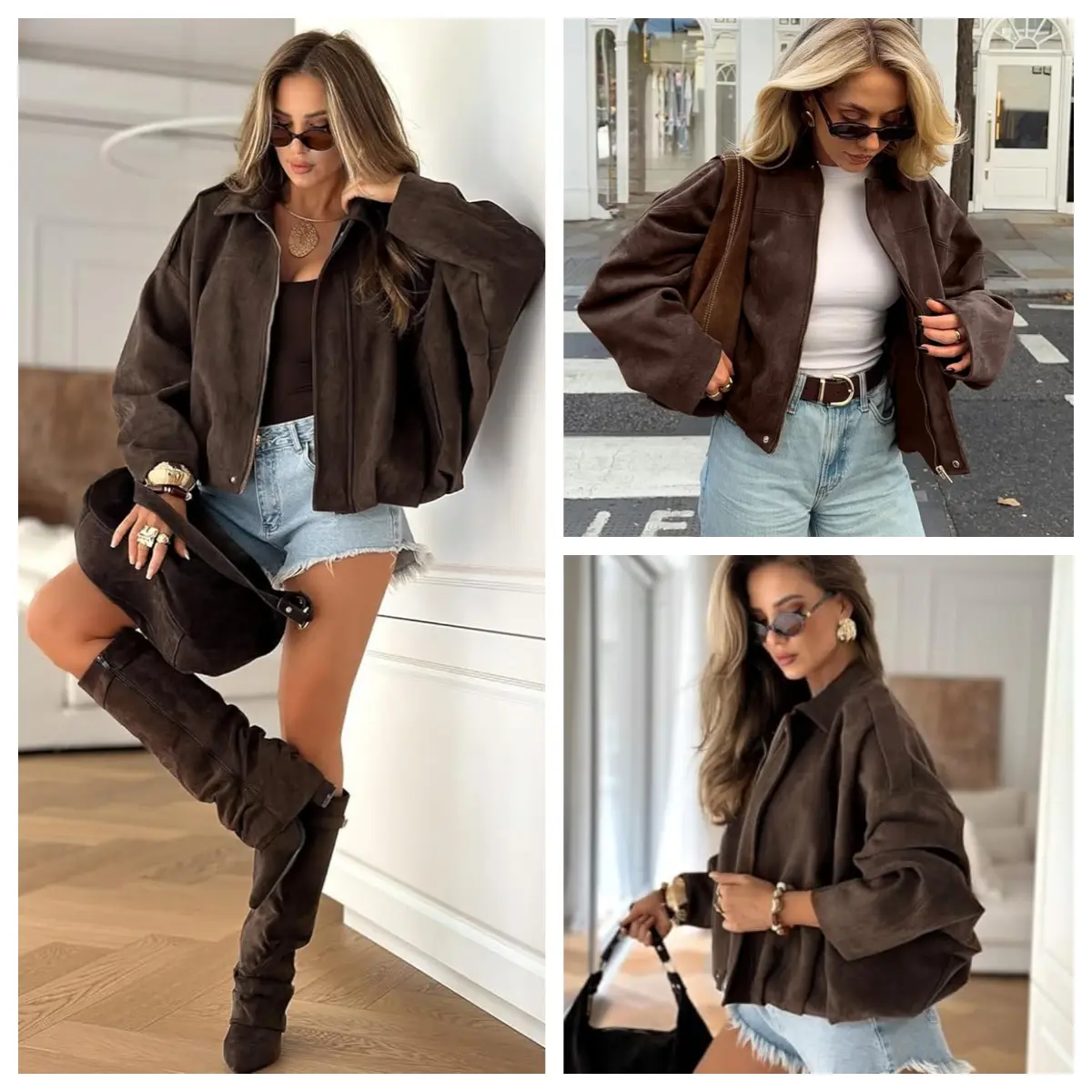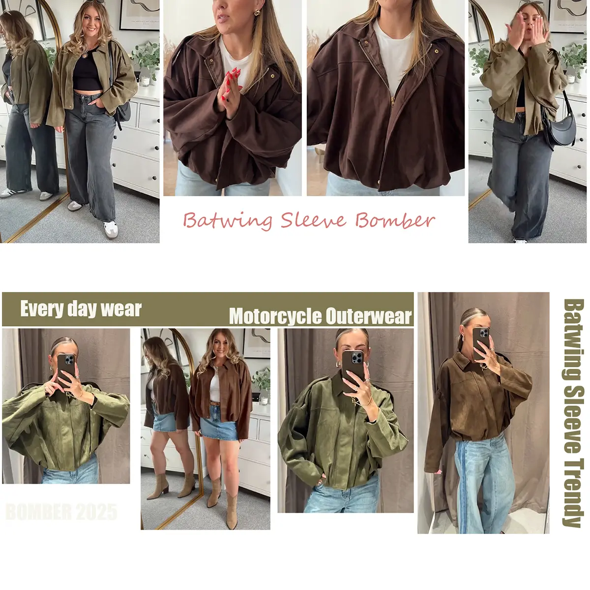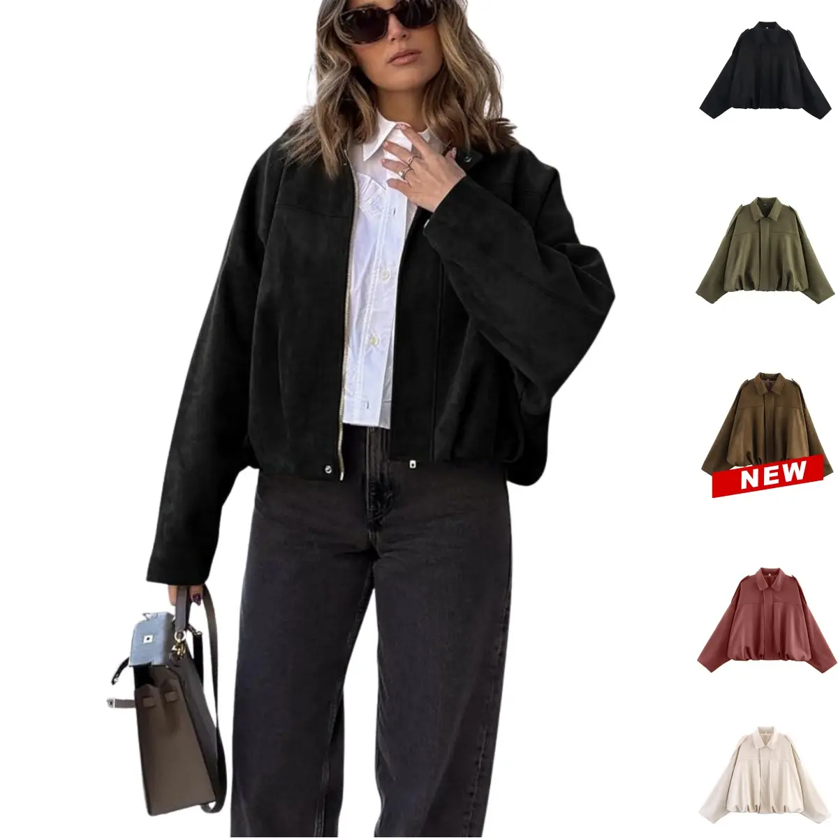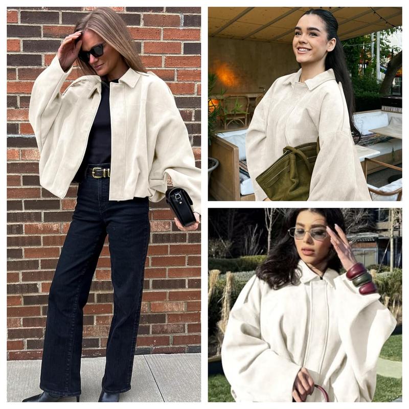 ·Oversized women’s faux suede bomber jacket with a chic streetwear look. Features a lapel collar, batwing sleeves, and drop shoulders. Shoulder epaulets and a pleated hem enhance its modern silhouette. Perfect for casual everyday wear. 🧥