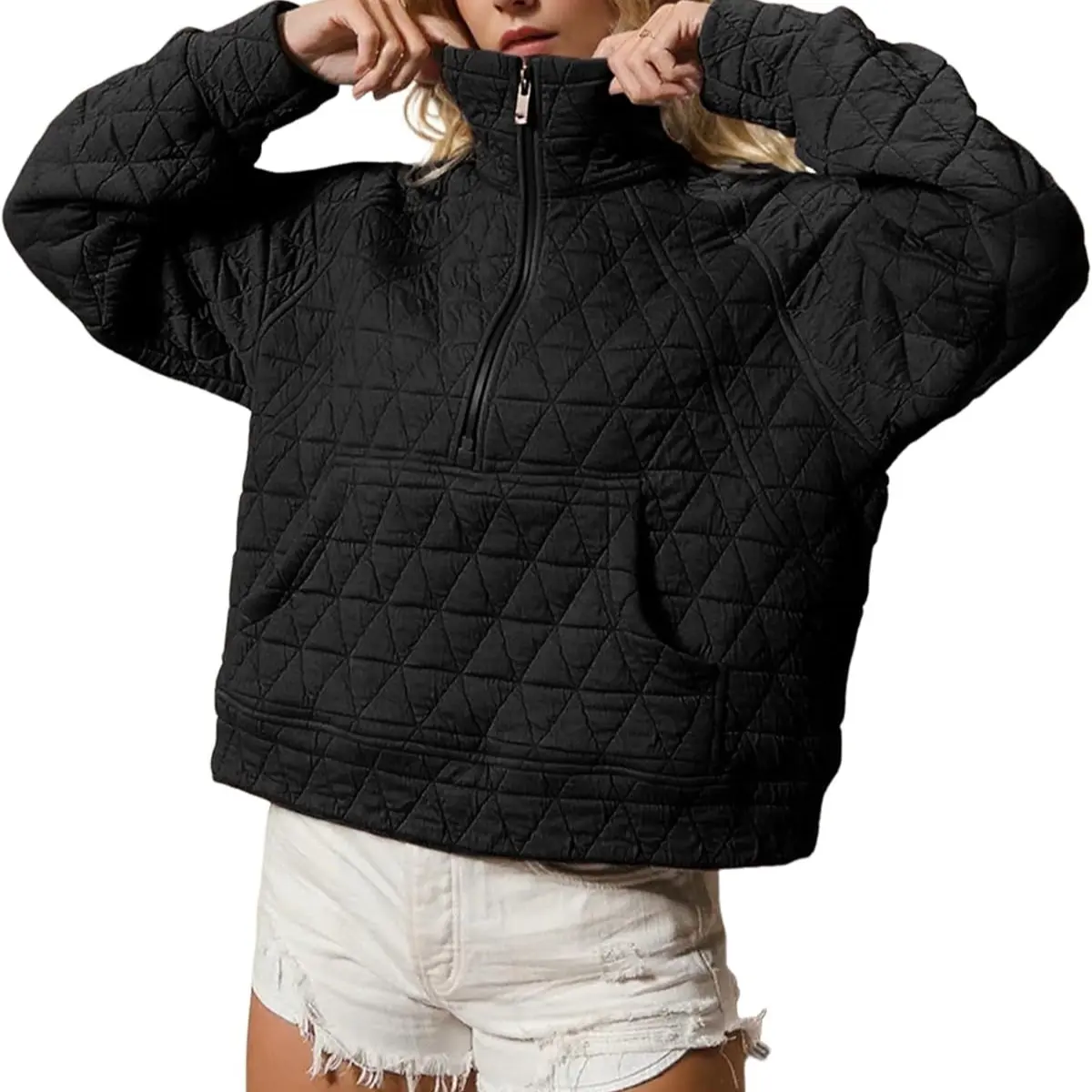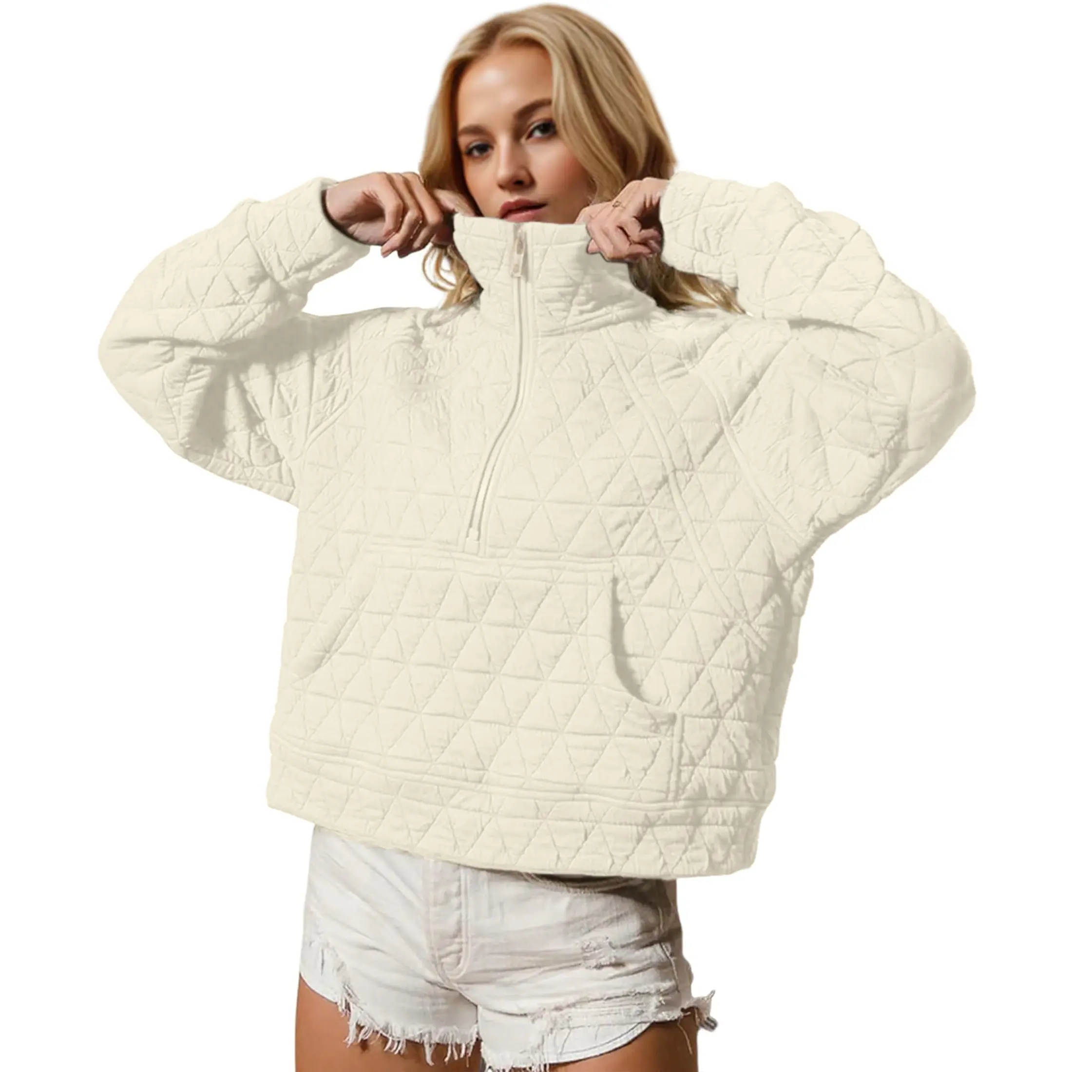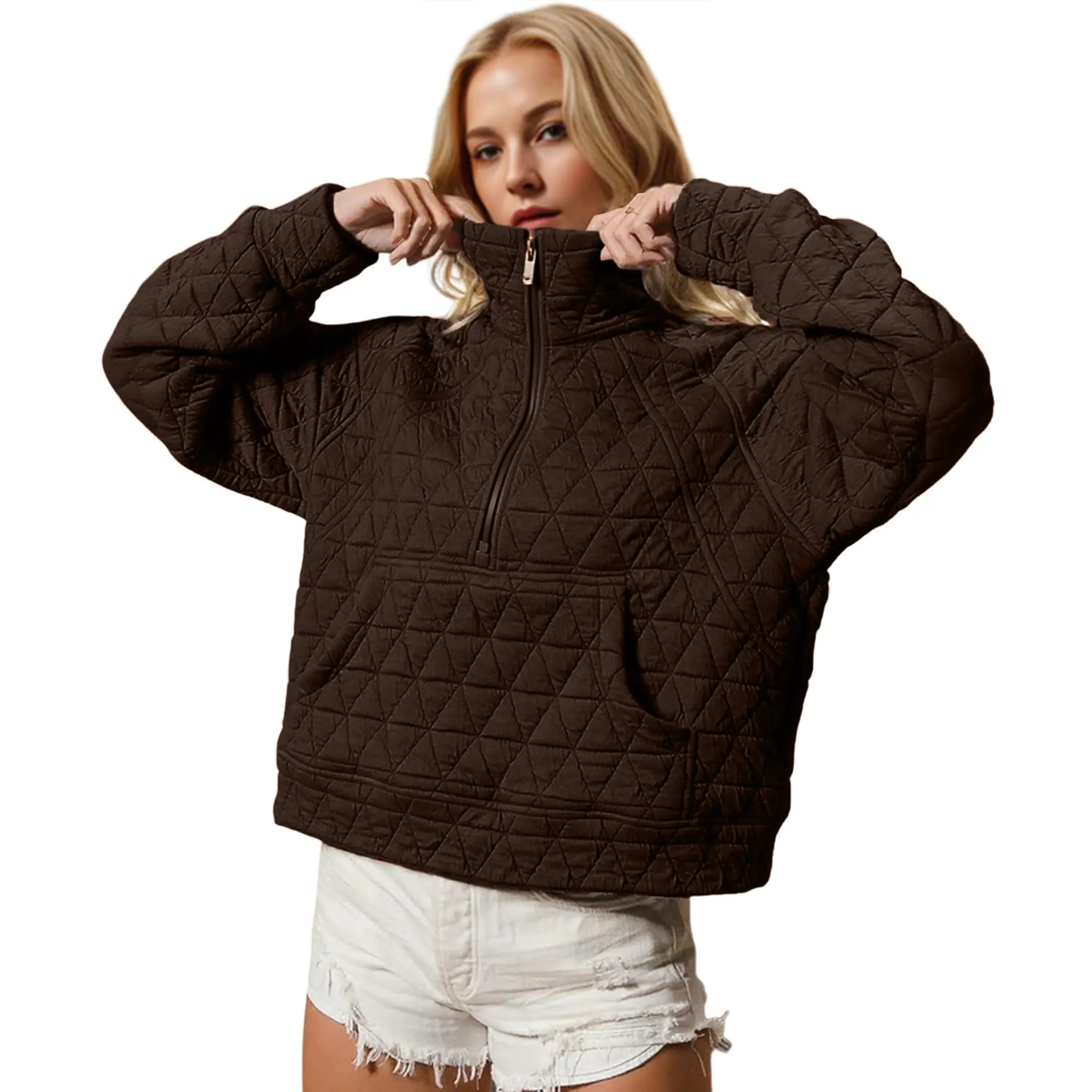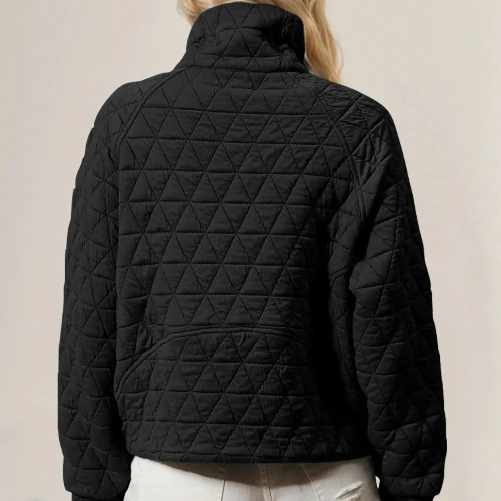 Trendy women’s half-zip pullover jacket made from 95% Polyester and 5% Spandex for a soft, stretchy, and comfortable fit. Features a functional front zipper and high collar for adjustable ventilation and warmth. The stylish all-over diamond quilted pattern adds texture, dimension, and a modern streetwear vibe. Perfect for fall and winter, this quilted sweatshirt combines fashion and practicality for a cozy, on-trend look.