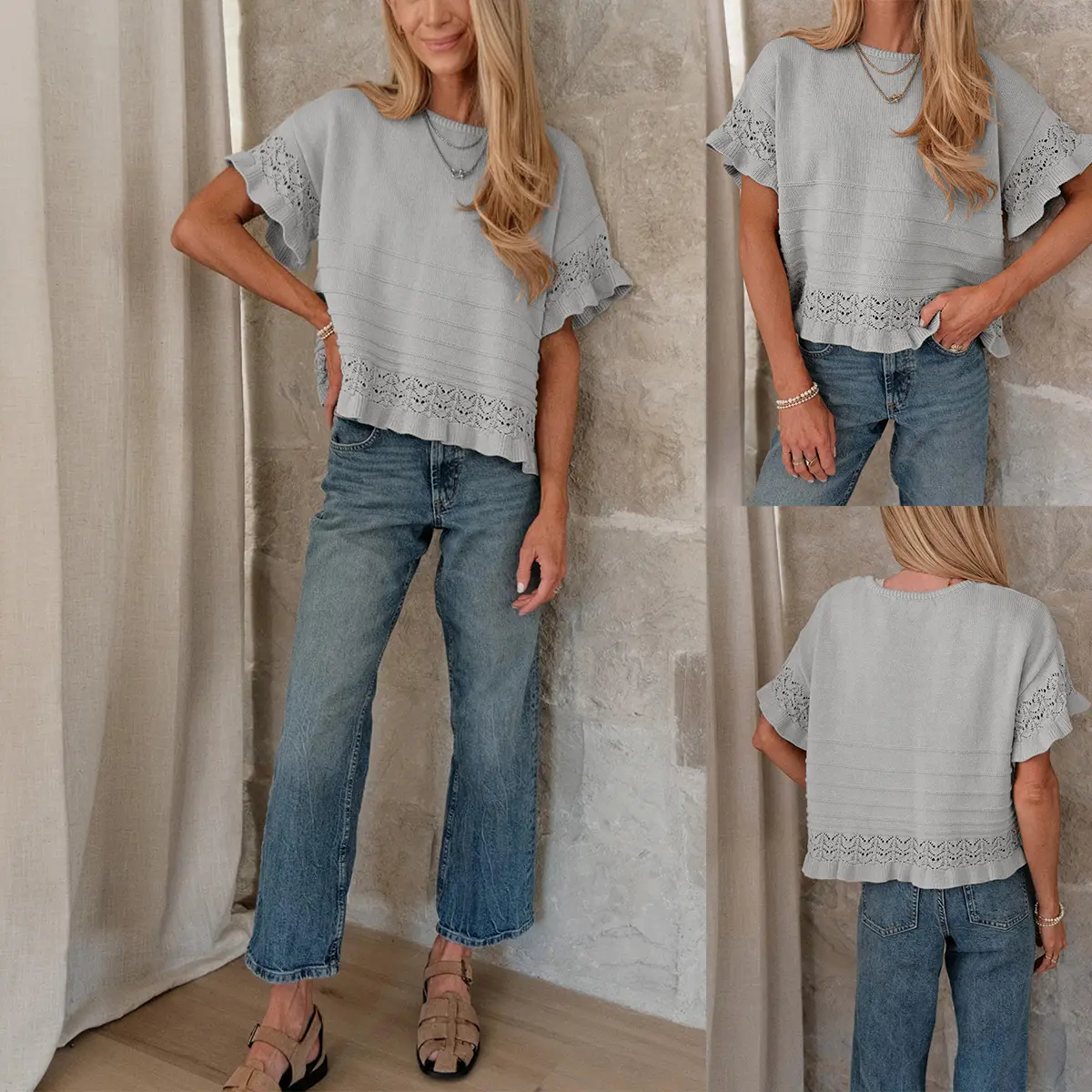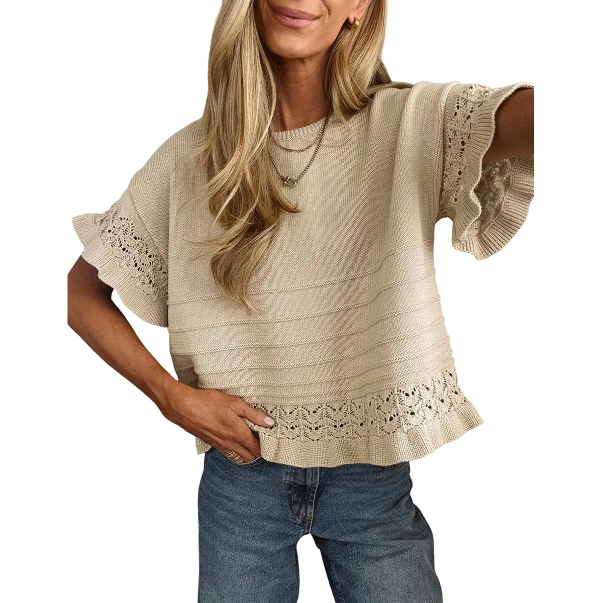 Features: Designed with a sophisticated round neckline and delicate ruffle trim on the short sleeves and hem, this sweater offers an intricate knit pattern that provides a breathable, lightweight texture.