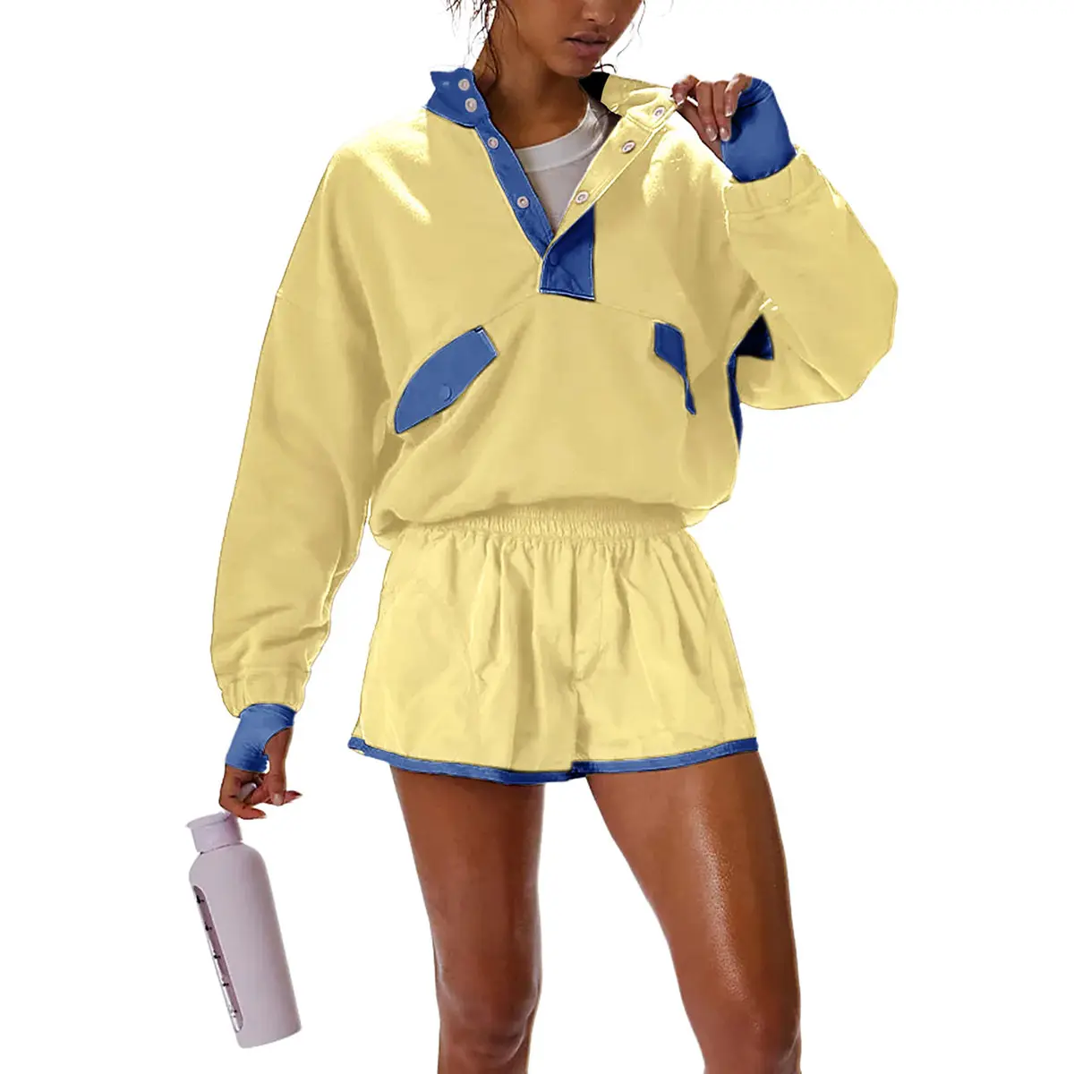 Designs: Sweat suits for womens 2 piece include long sleeve sweatshirts and elastic waist shorts. Tops of 2 piece athletic sets for women use button design, can be worn as v neck or mock neck shirts. The sweatshirt and shorts set women use color block style, create your summer looking with bright beauty
