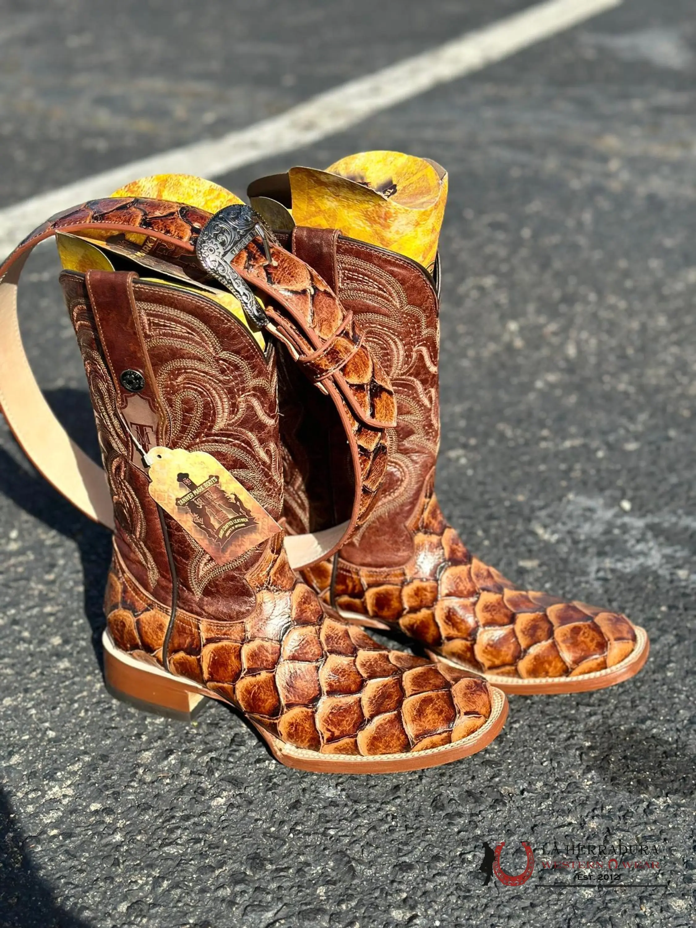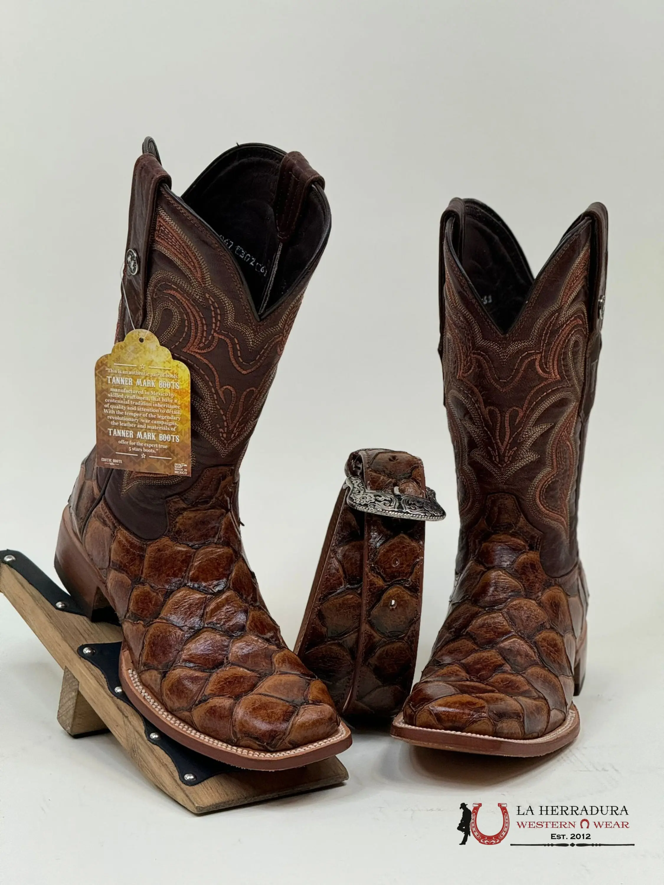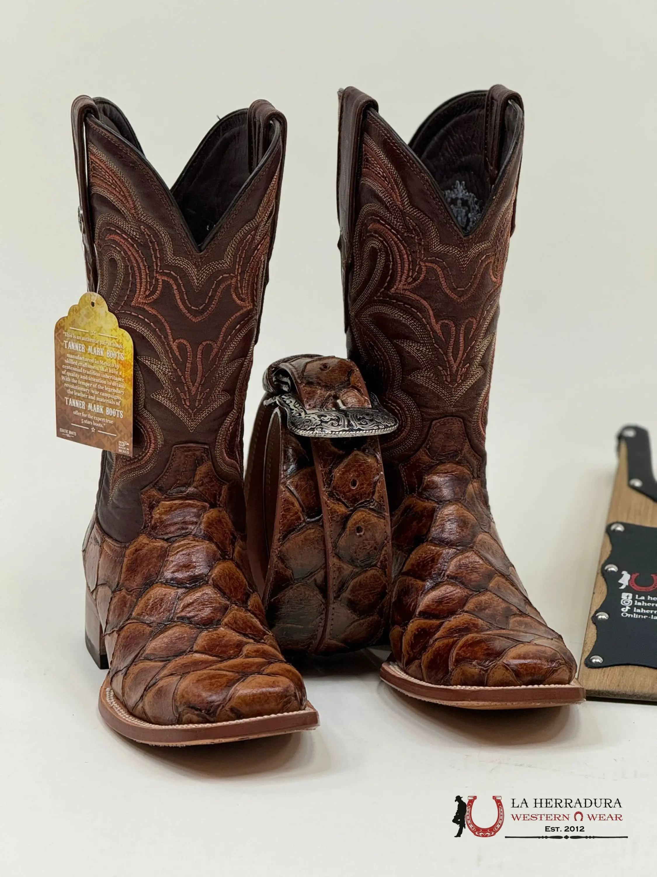 Style meets functionality with these Tanner Mark boots in a unique fish print. The cognac color adds a touch of sophistication, and it even comes with a matching belt for a complete look. Dress up any outfit with these medium fit boots that are sure to turn heads.