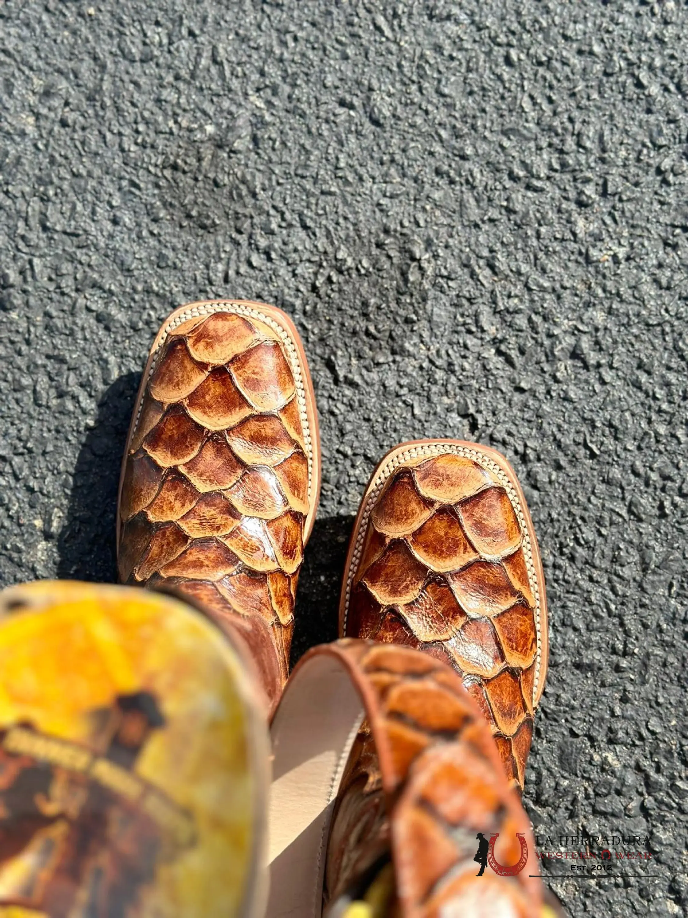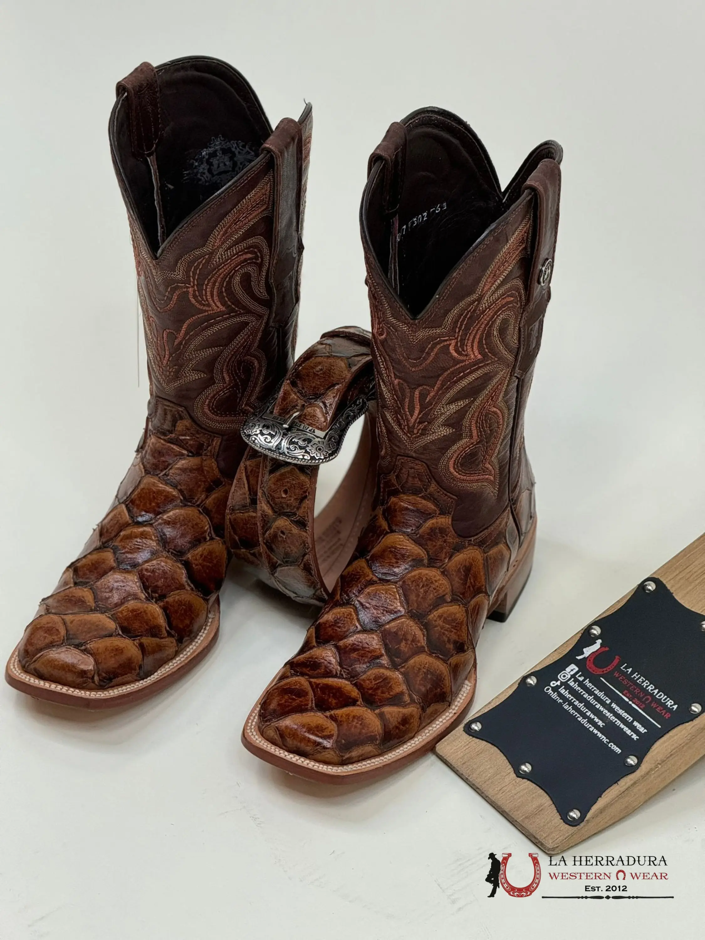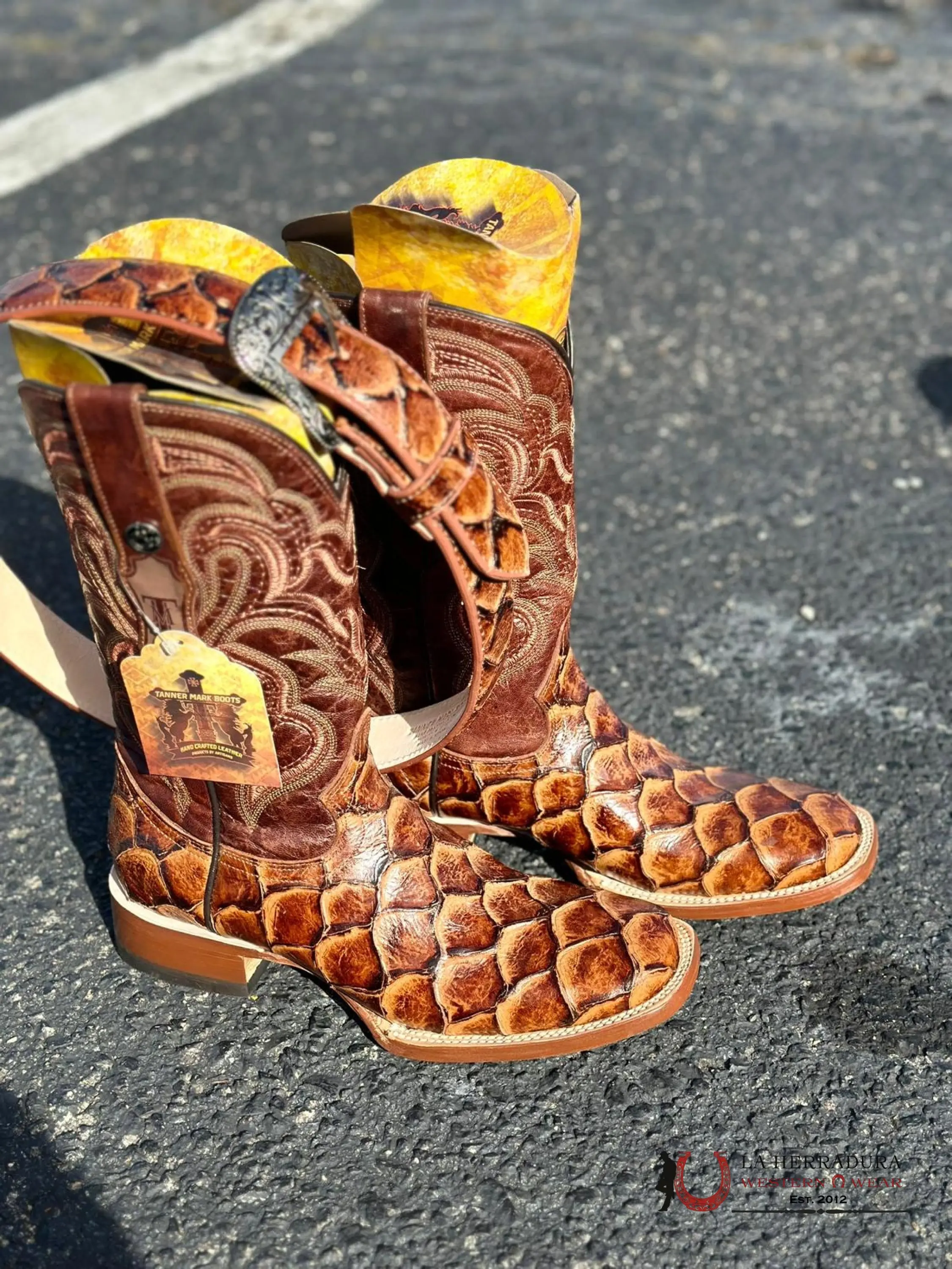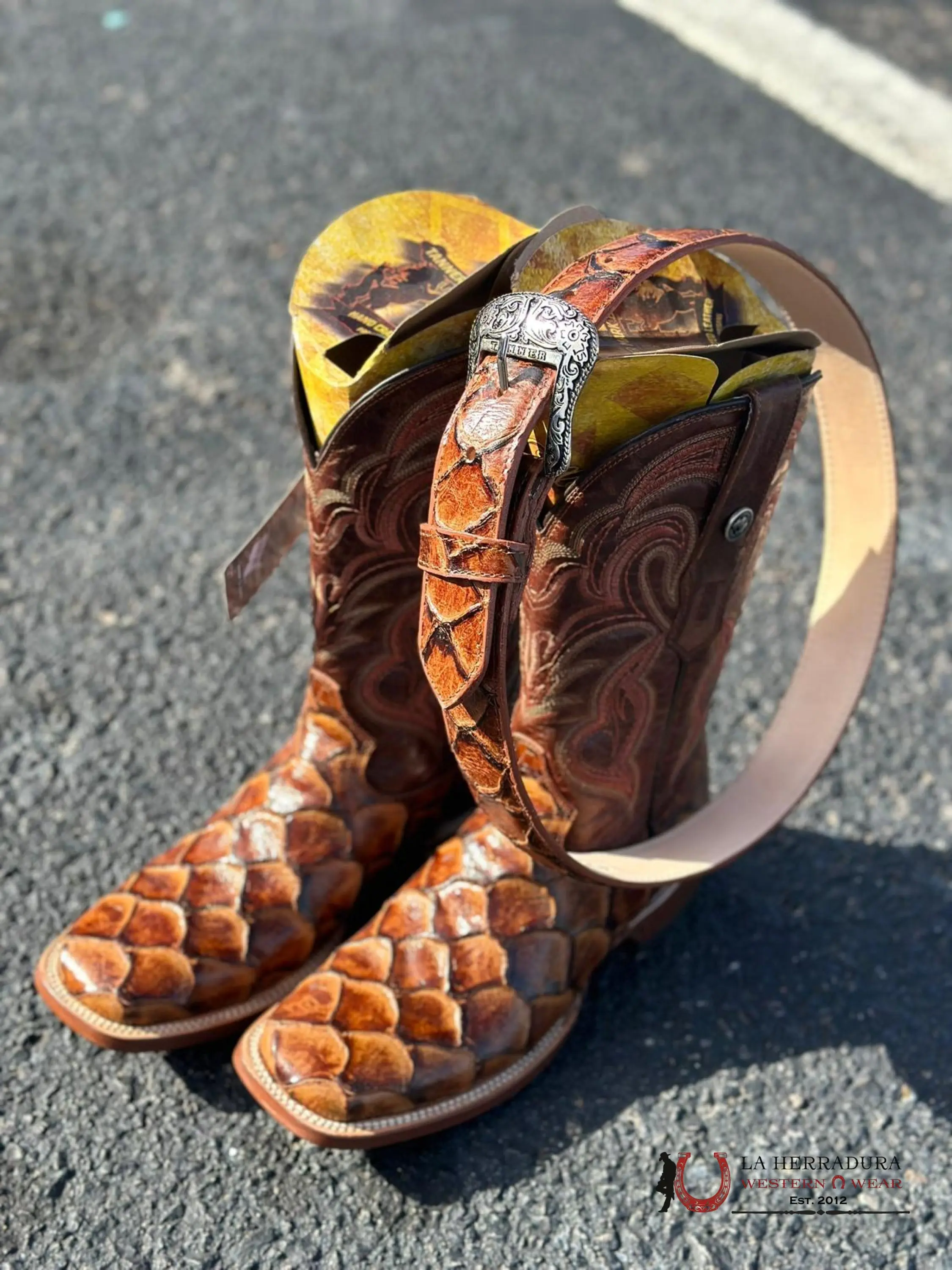 Style meets functionality with these Tanner Mark boots in a unique fish print. The cognac color adds a touch of sophistication, and it even comes with a matching belt for a complete look. Dress up any outfit with these medium fit boots that are sure to turn heads.