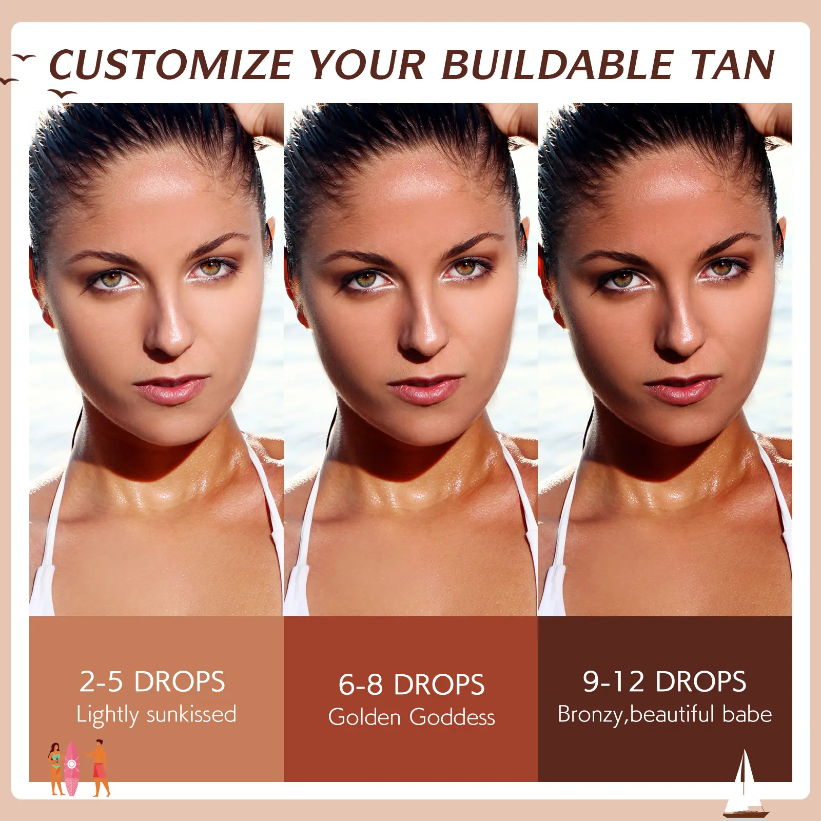 ·Natural ingredients: Our tanning oil drops are made of natural ingredients without add chemicals, safe and non-irritating is vegan, cruelty-free for all skin types.Light and non-greasy: Our tan drops has a light and non-greasy texture that can be quickly absorbed into the skin without causing burden and discomfort.