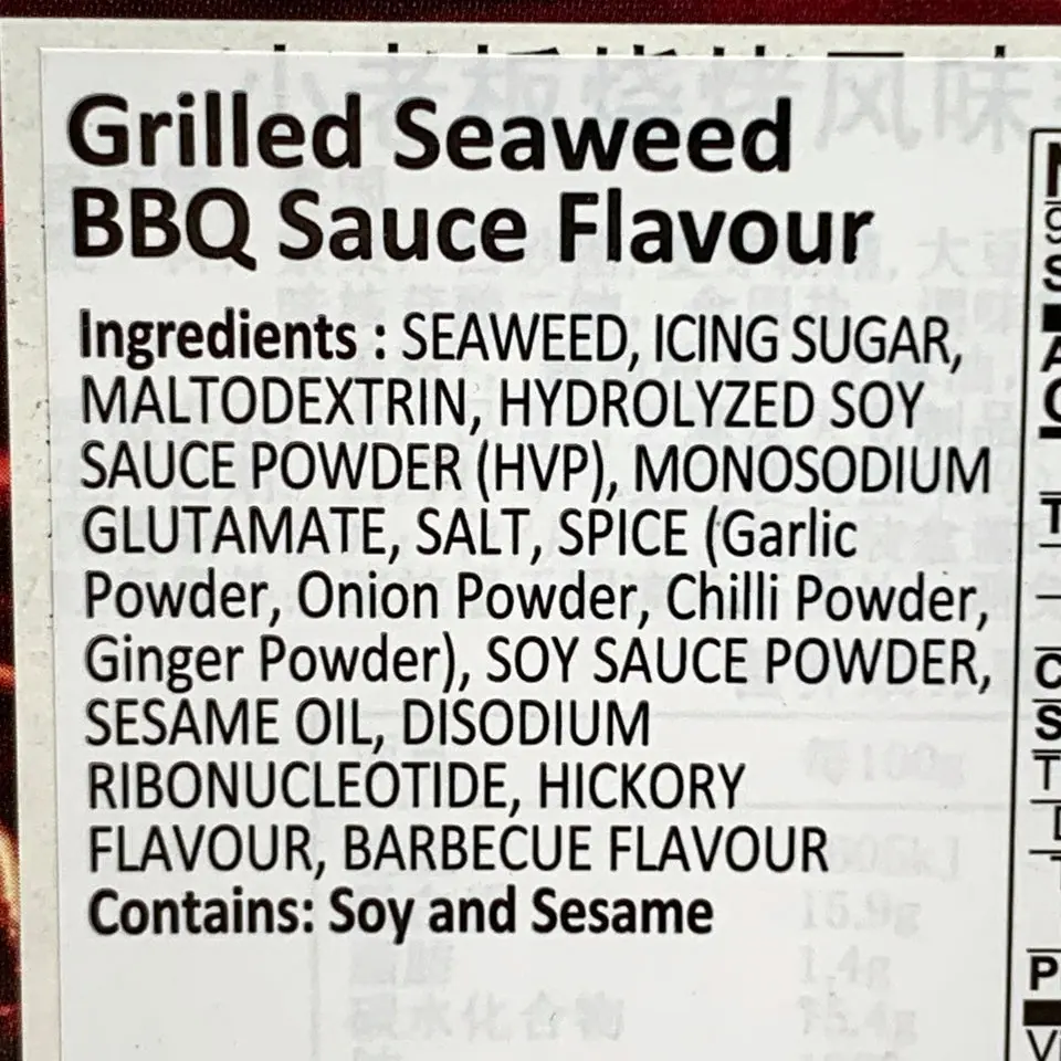 IngredientsSeaweed, sugar, and seasonings, with specific ingredients varying by flavor.