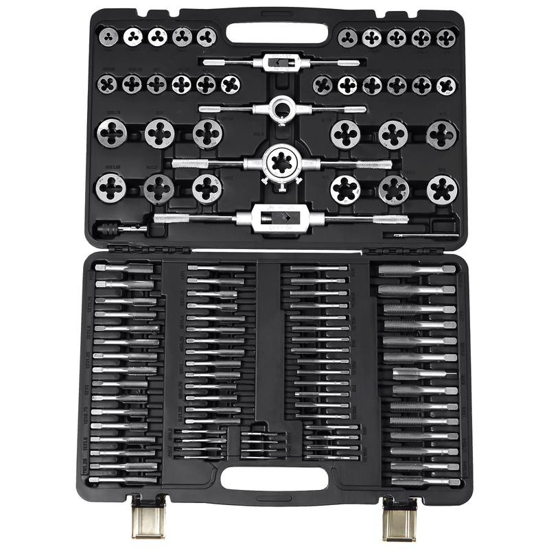A professional 110-piece set of taps and dies, including various sizes of 35 pcs taper taps, 35 pcs plug taps, 35 pcs dies, 2 pcs tap wrenches, 2 pcs die wrench,and 1 pc T-type tap wrench, assisting you in efficiently completing thread-cutting tasks.