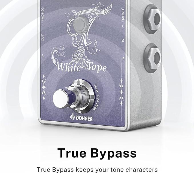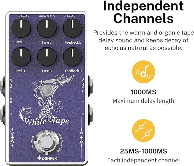 Donner White Tape is an analog circuit stereo tape delay pedal that realistically emulates the sound of those legendary tape echo machines,which is warm and vintage.You can create an immersive 3D sound as their repeats are able to play out of two amplifiers.